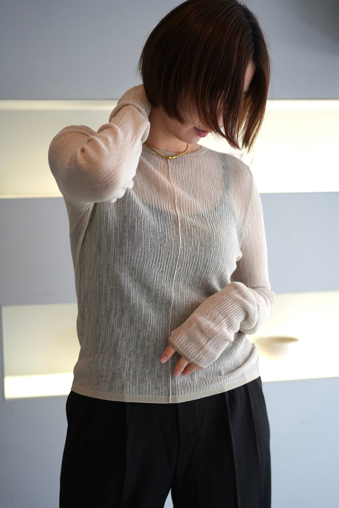 とても繊細なリブニット。程よい透け感で、透けすぎず着やすく仕上げています。