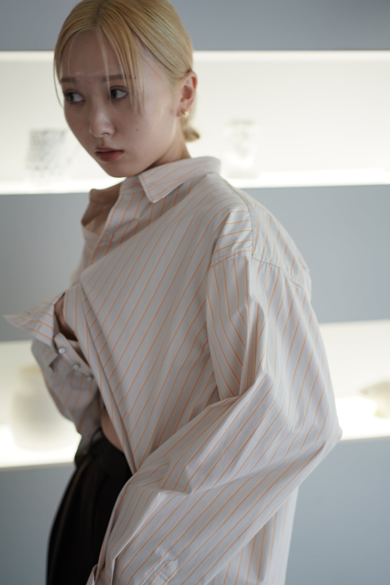 オーバーなサイズ感でありながらもメンズのシャツを着ているような、全てのパーツがオーバーなだらしない印象にはならない用に袖丈は調整。