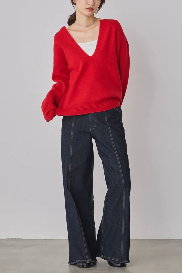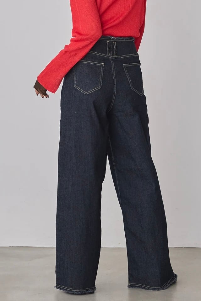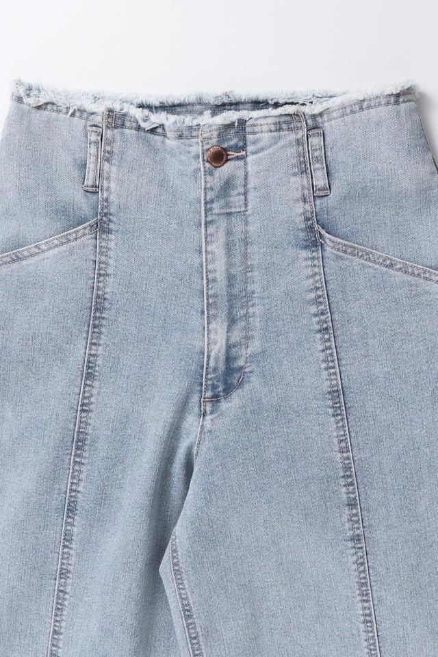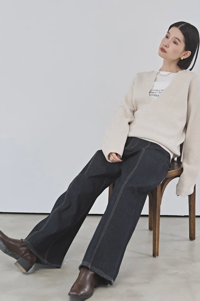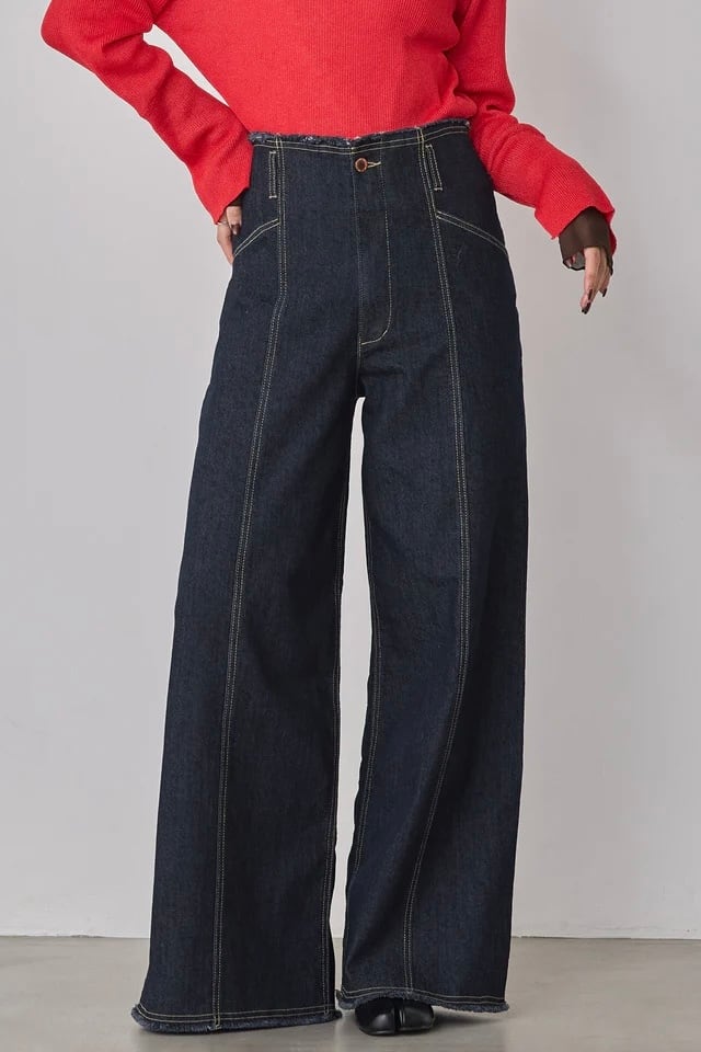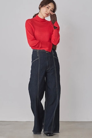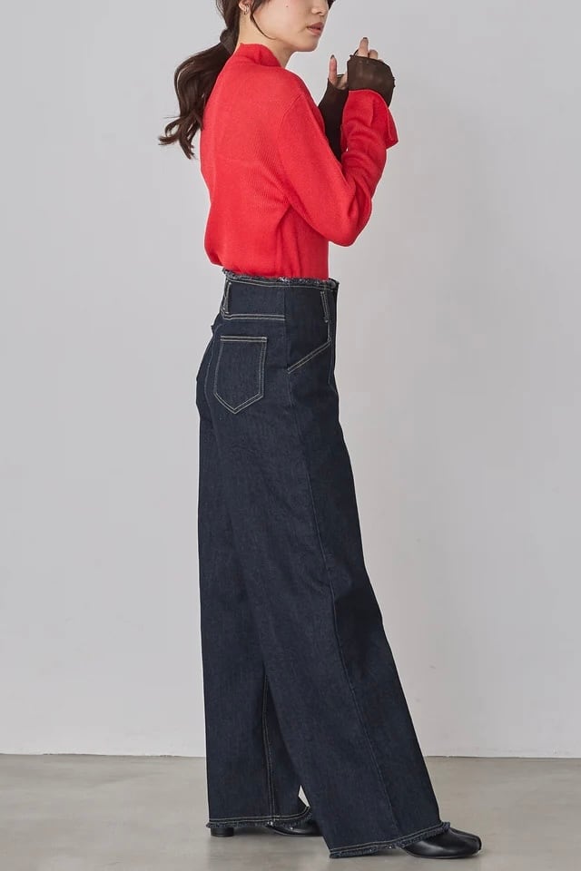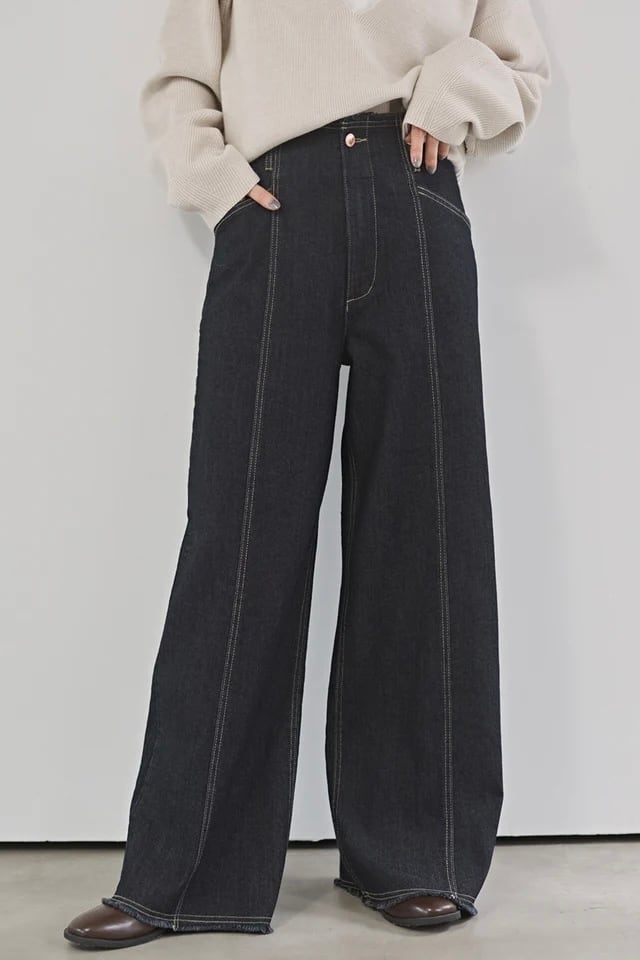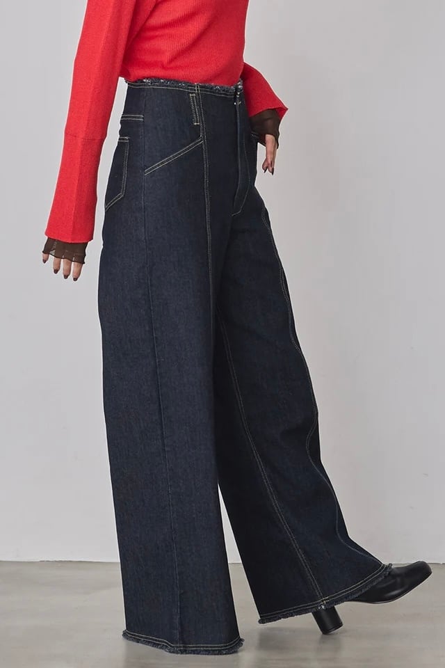 ハイウエスト+フロント中心にステッチをいれ、Iラインを強調しスタイルアップできるデニムワイドパンツ。