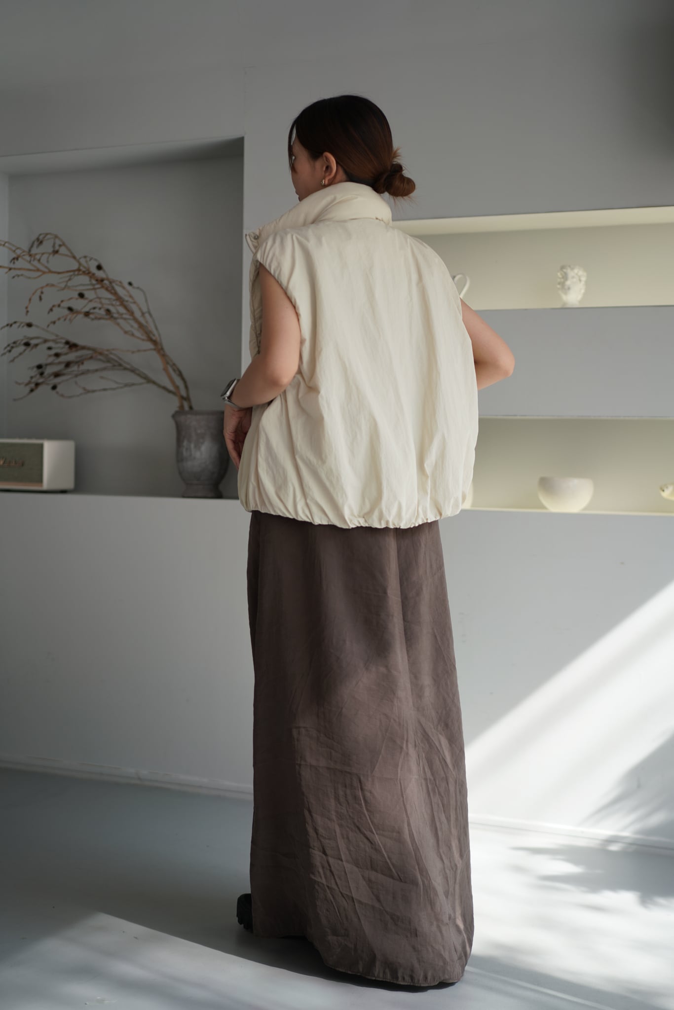 ボリューミーなバルーンシルエットが今っぽい薄中綿ベスト。