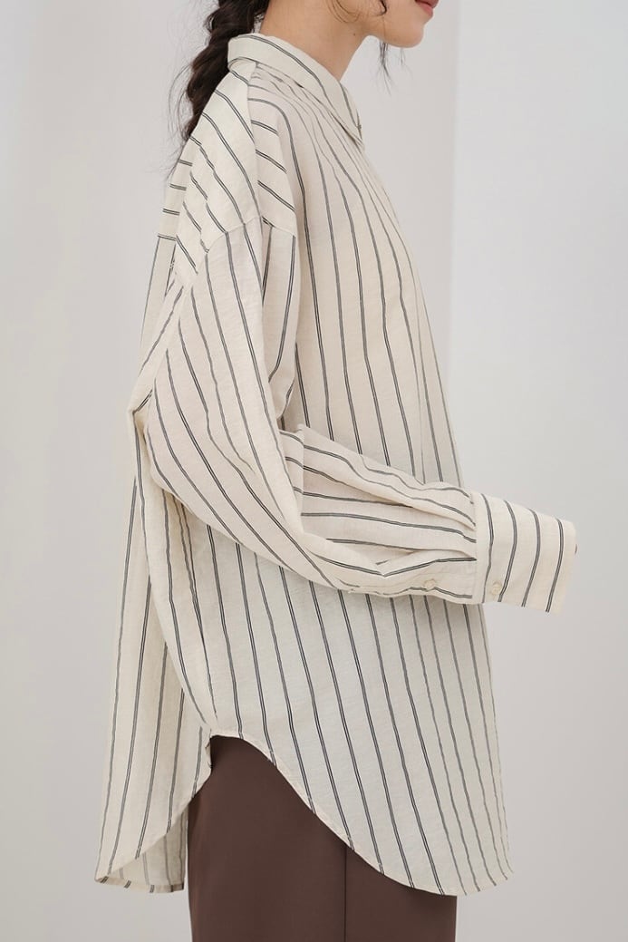 秋にぴったりな淡色で優しい色合いのシアーシャツが登場!丈感が少し長めなのでトップスとしても羽織としても使いまわしのきく万能アイテムです。秋らしいサテンスカートやキャミワンピースの上から着ると映えるデザインになっています。シンプルながらもストライプ柄を取り入れることでIラインを意識したスタイルアップして見えるシャツに仕上がりました。