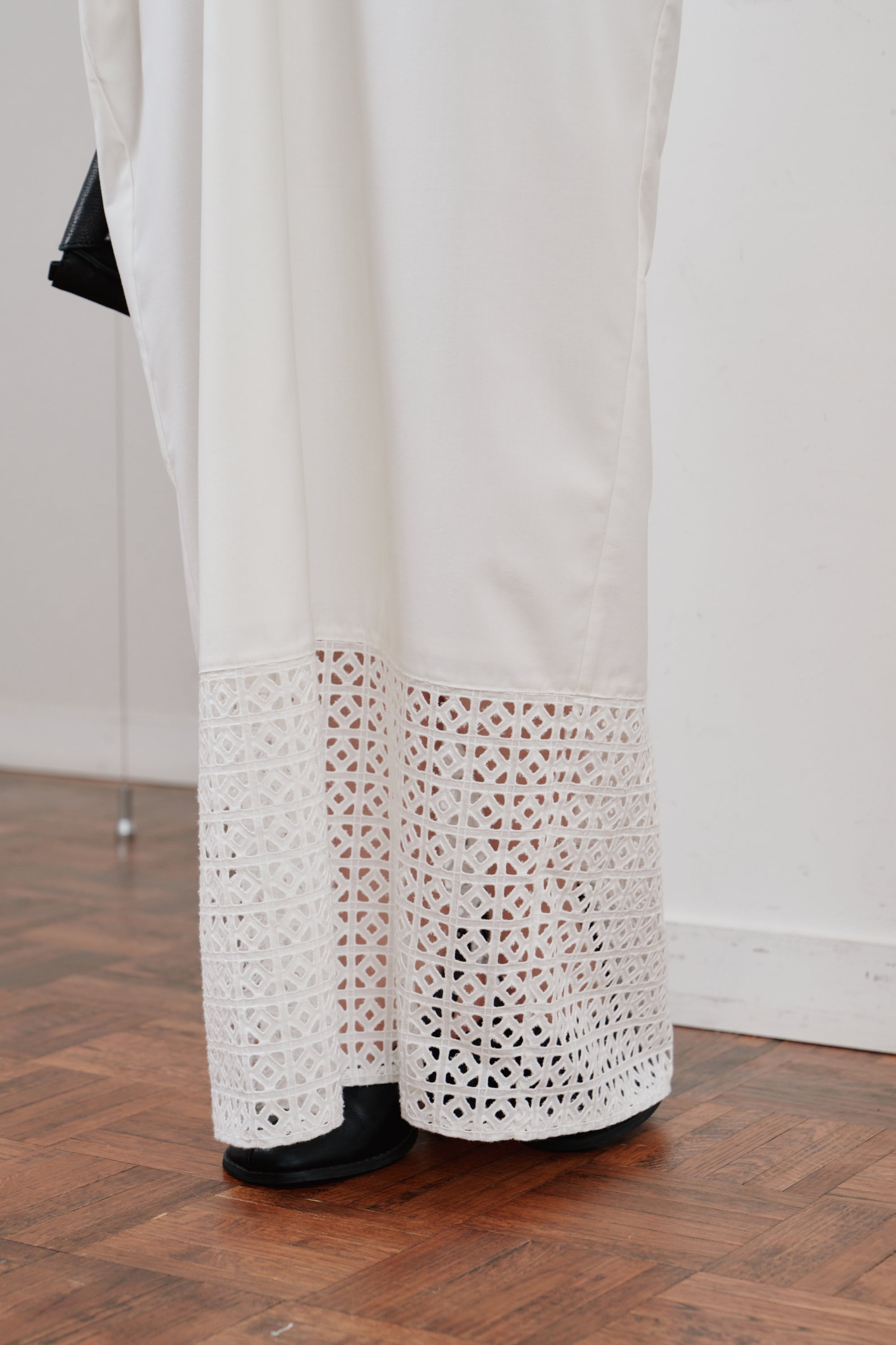 さらりと落ちる上品な素材は、動くたびに美しいドレープを描き出し、涼やかさとエレガンスを両立。