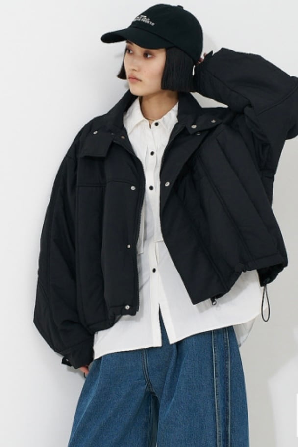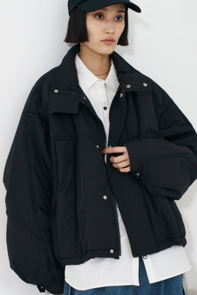 ジップを開けてインナーのロゴTや柄トップスを覗かせればカジュアルなスタイリングに、全部閉めれボリュームのあるシルエット感が楽しめるモードなスタイリングに変身。