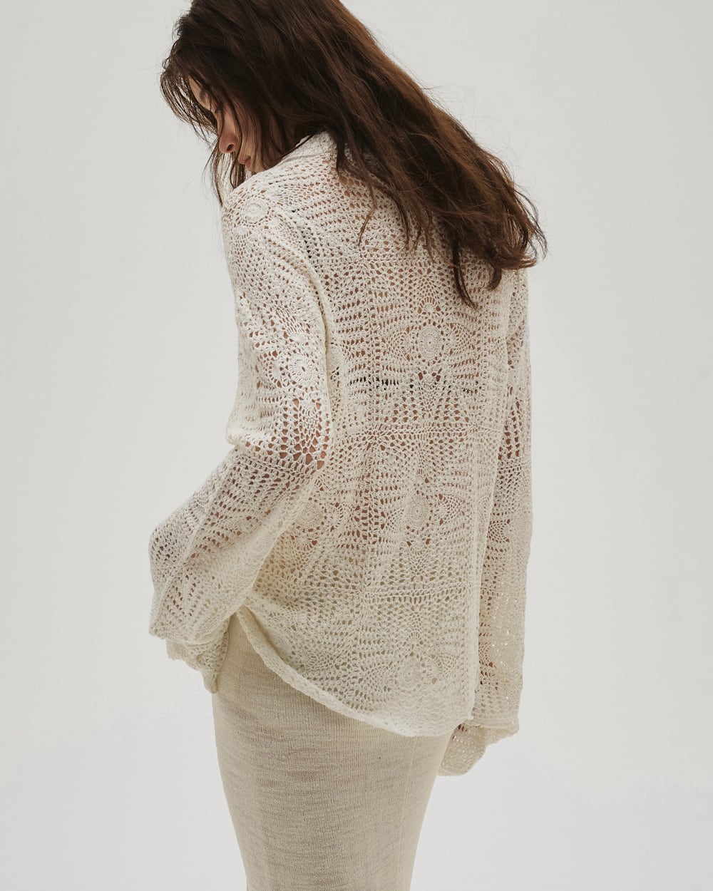 華奢なコットン糸を使用して、南インドで一つ一つ丁寧に手編みで編まれたかぎ針のニットシャツ。