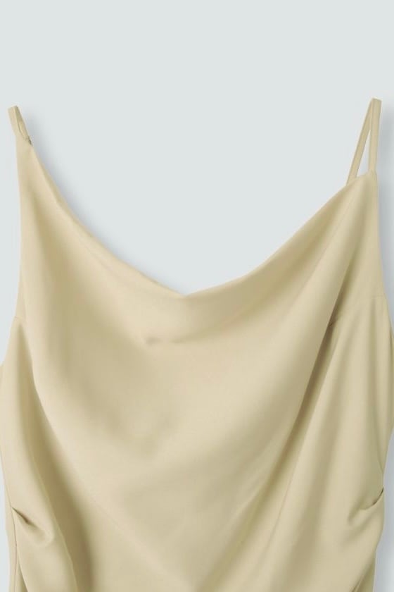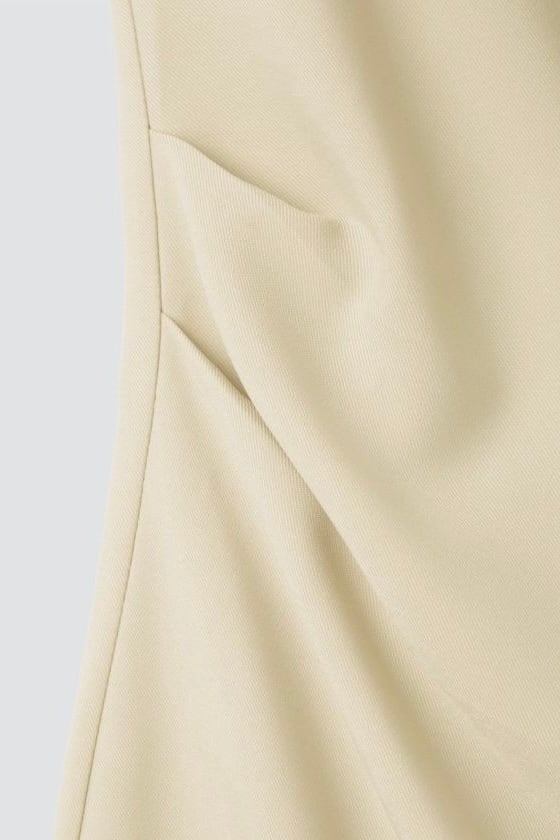 胸元のアシンメトリードレープから脇に施したタックドレープ、