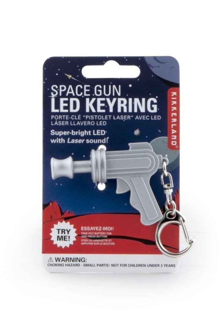 引き金部分のボタンを押すと銃口を光らせて"ピュンピュン"と音が鳴る、スペースガンのノイジーキーリング。