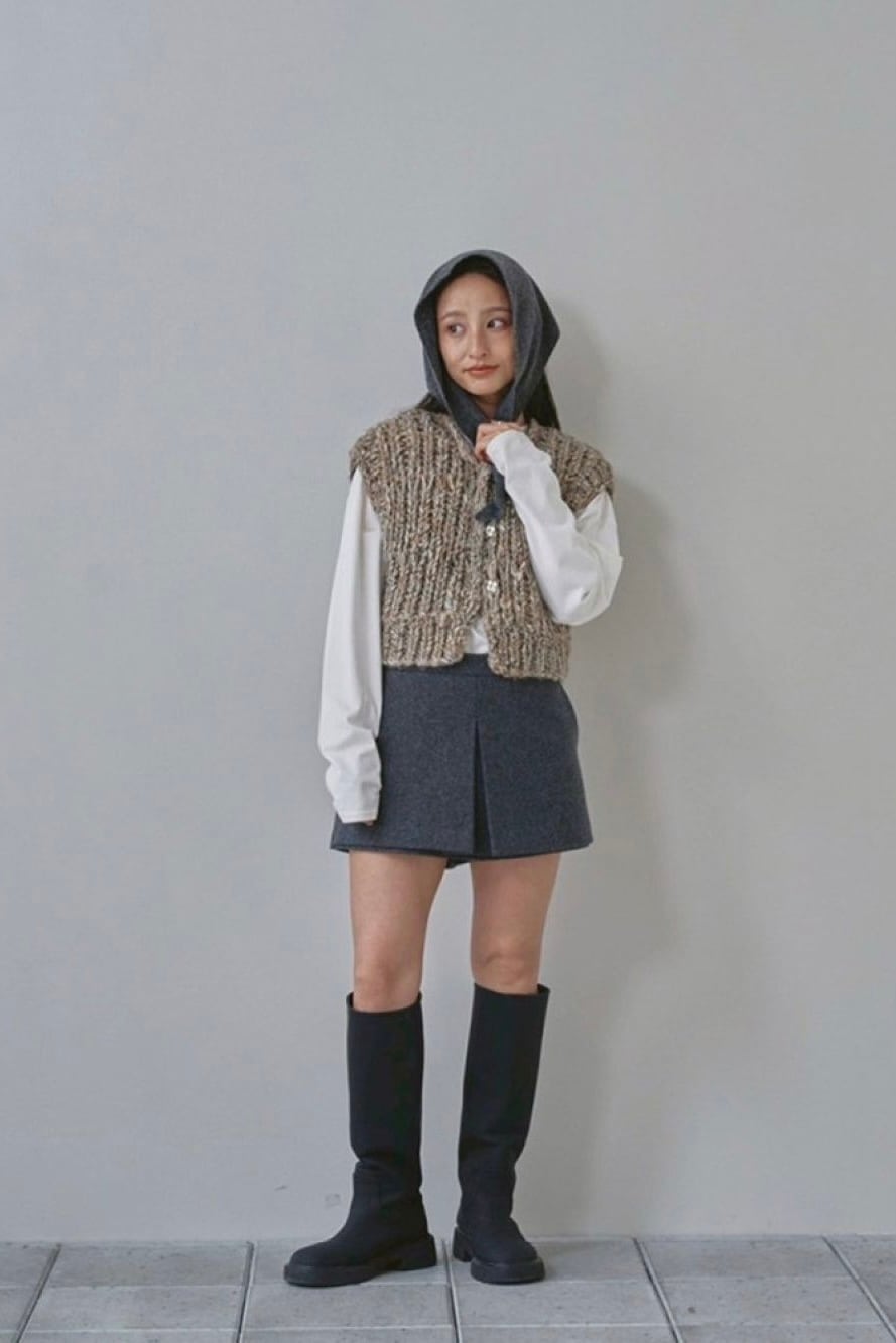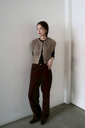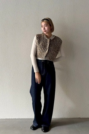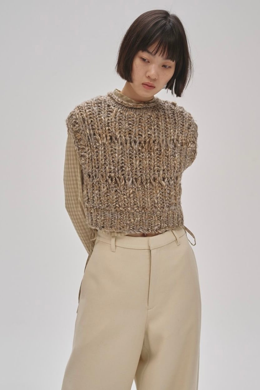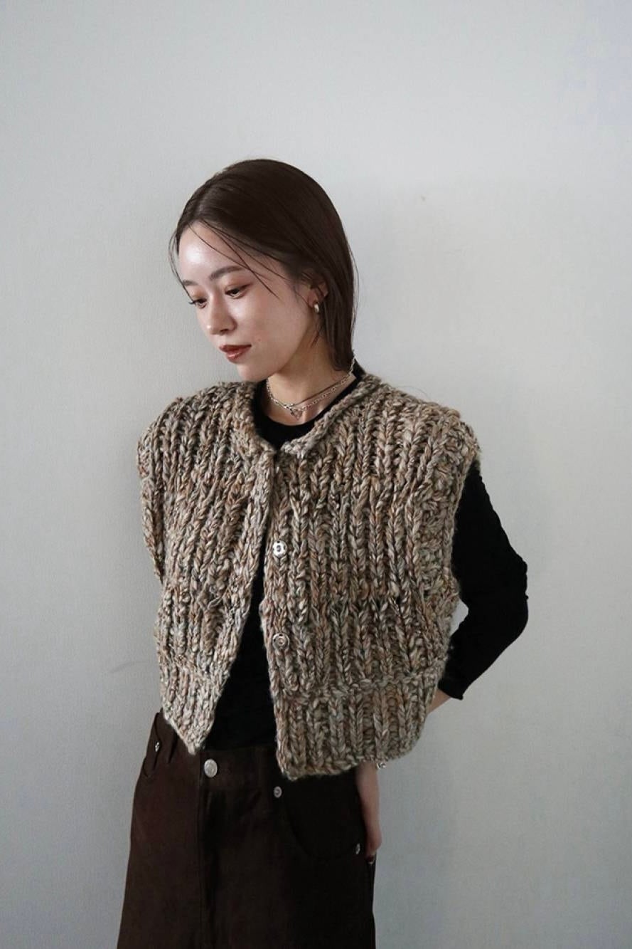 イタリア糸を使用し、一つ一つ丁寧に手編みされたニットベスト。目をひくミックスカラーに加え、新色のダークブラウンはふっくらとした風合いの糸が魅力。手編みならではのゆるっとした編み目がシーズンムードたっぷりな一枚。カットソーやスウェットに重ねるのはもちろん、肌触りが柔らかく着心地も抜群なので、キャミソールの上にさらっと羽織るスタイルもおすすめ。前後2wayで着用できます。