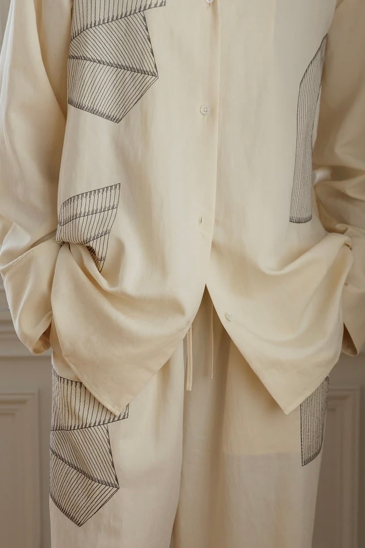 生地の段階ではなく、製品に仕立てた後に刺繍を加えることで、縫い目やパターンとの調和が生まれ、より立体的で存在感のある表情に仕上げました。