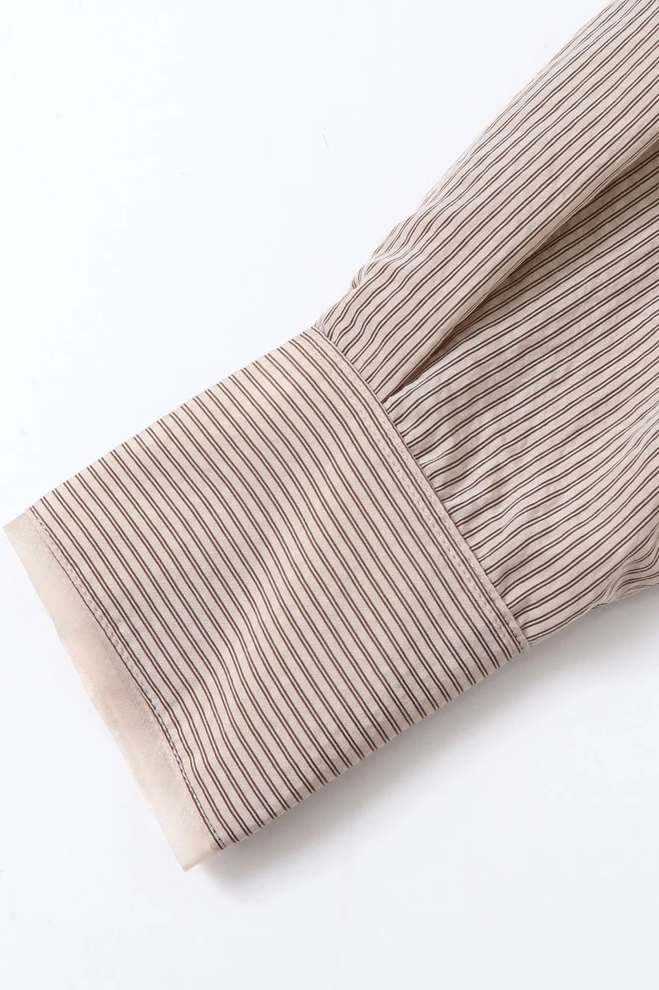シンプルなシャツベースで、別布を挟み込んだ広めのカフスがポイントです。ゆるっとオーバーな作りです。バックネック内側は、配色パイピング挟み込みです。