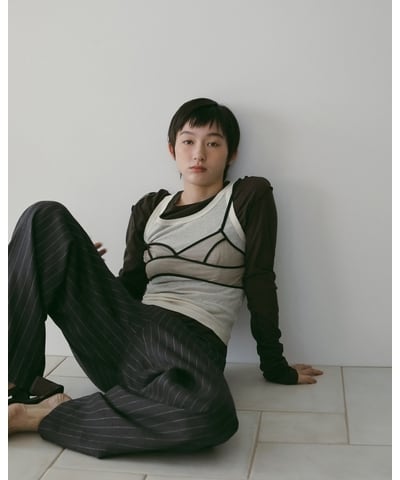 シアー生地と重なる曖昧な色の重なりがニュアンスある奥行きを生み、モードなレイヤードスタイルが完成します。