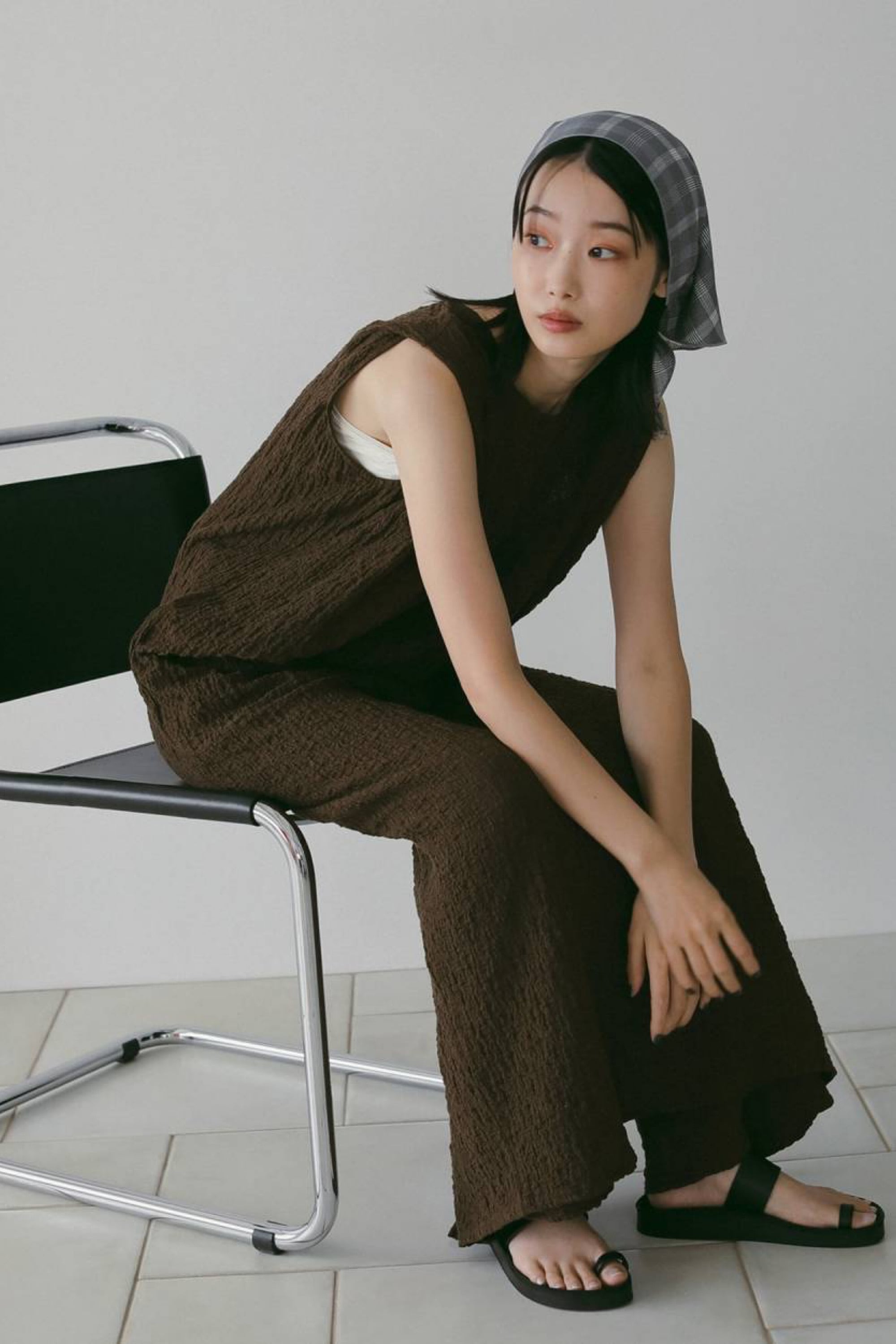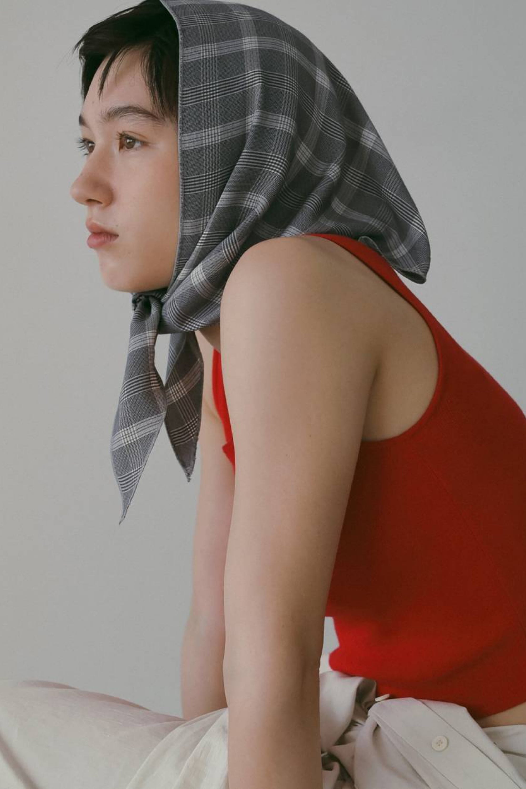 チェック柄が目を惹くスカーフ。三角タイプで、頭に巻くだけでこなれた着こなしに。日本の桐生で織られたオリジナルのチェック生地を使用しています。シンプルなスタイリングにも映え、トレンド感あるセンスを添える一枚。同素材のCheck Over JacketやCheck Daubletuck Pantsと合わせていただくのもおすすめです。