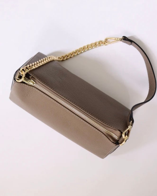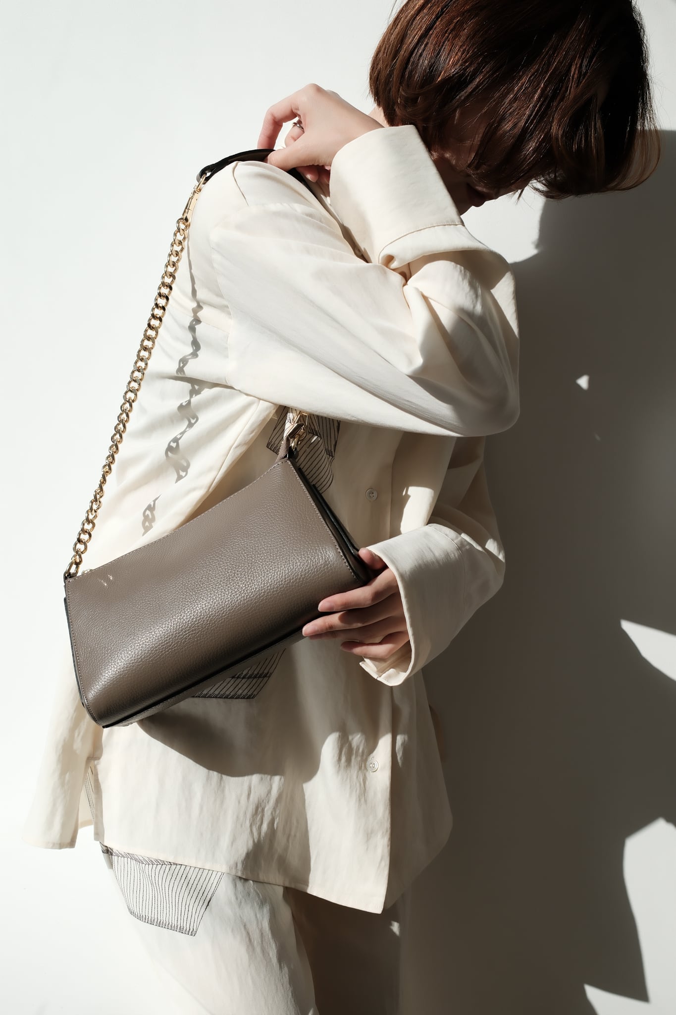 チェーン使いが新鮮なドラムレザーバッグ。アクセサリー感覚でもちたい、トレンド感のあるアイテム。