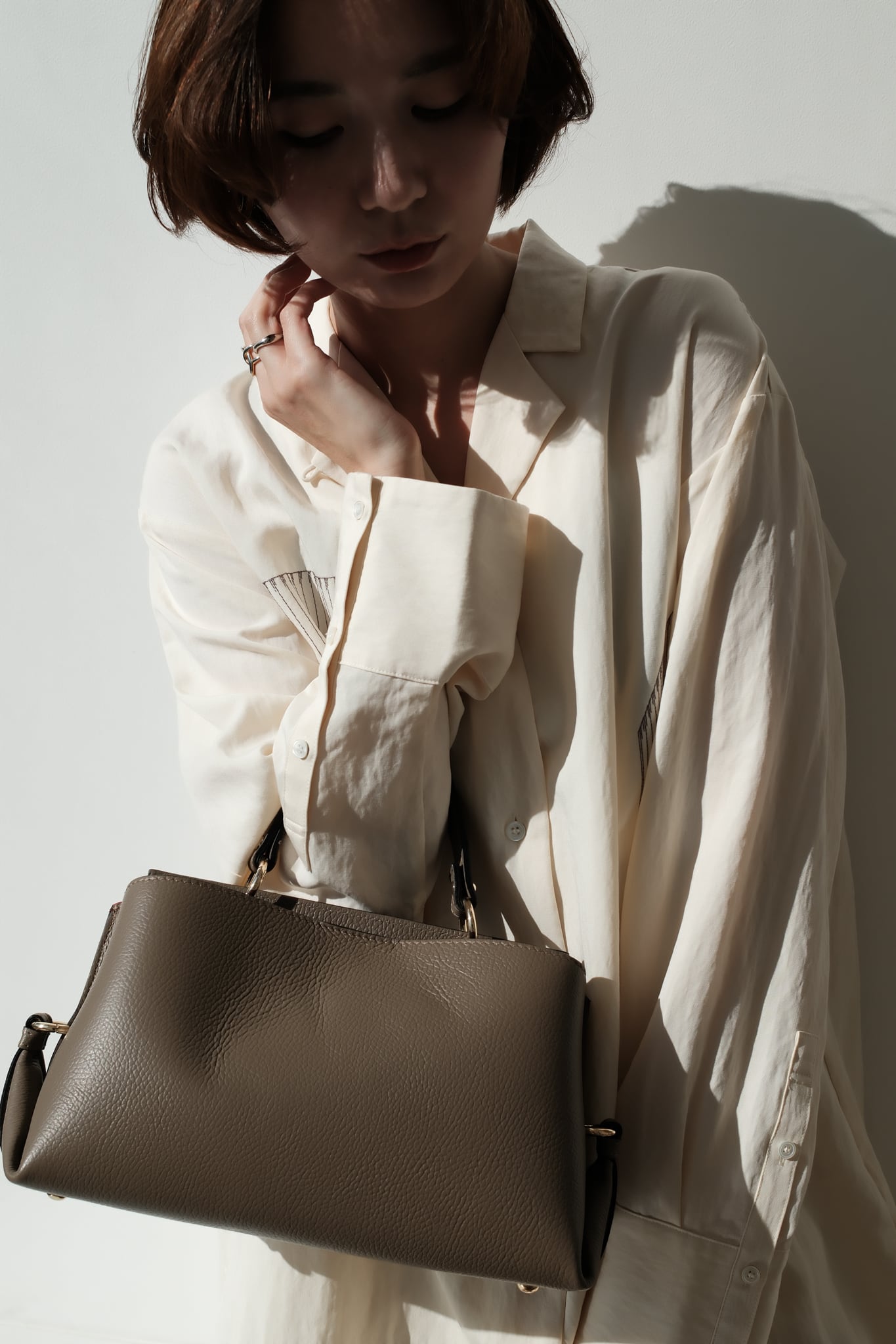 ワンハンドルデザインがシックなムードのトラペーズバッグ。