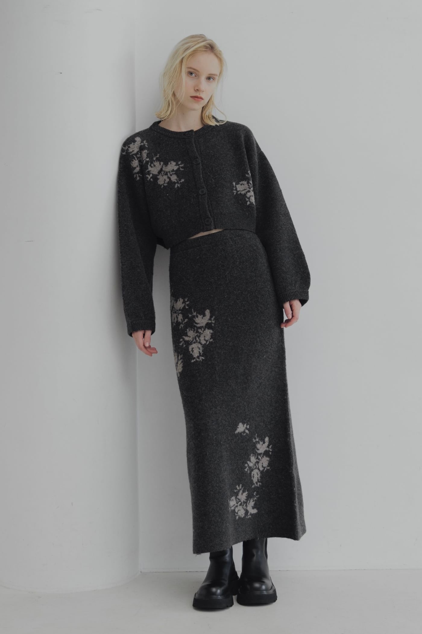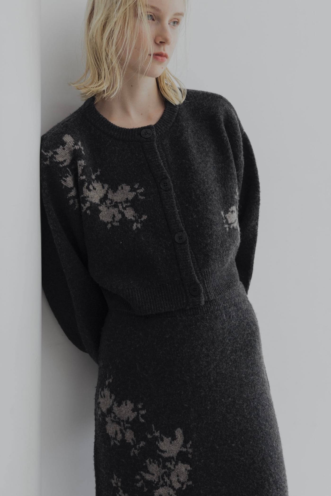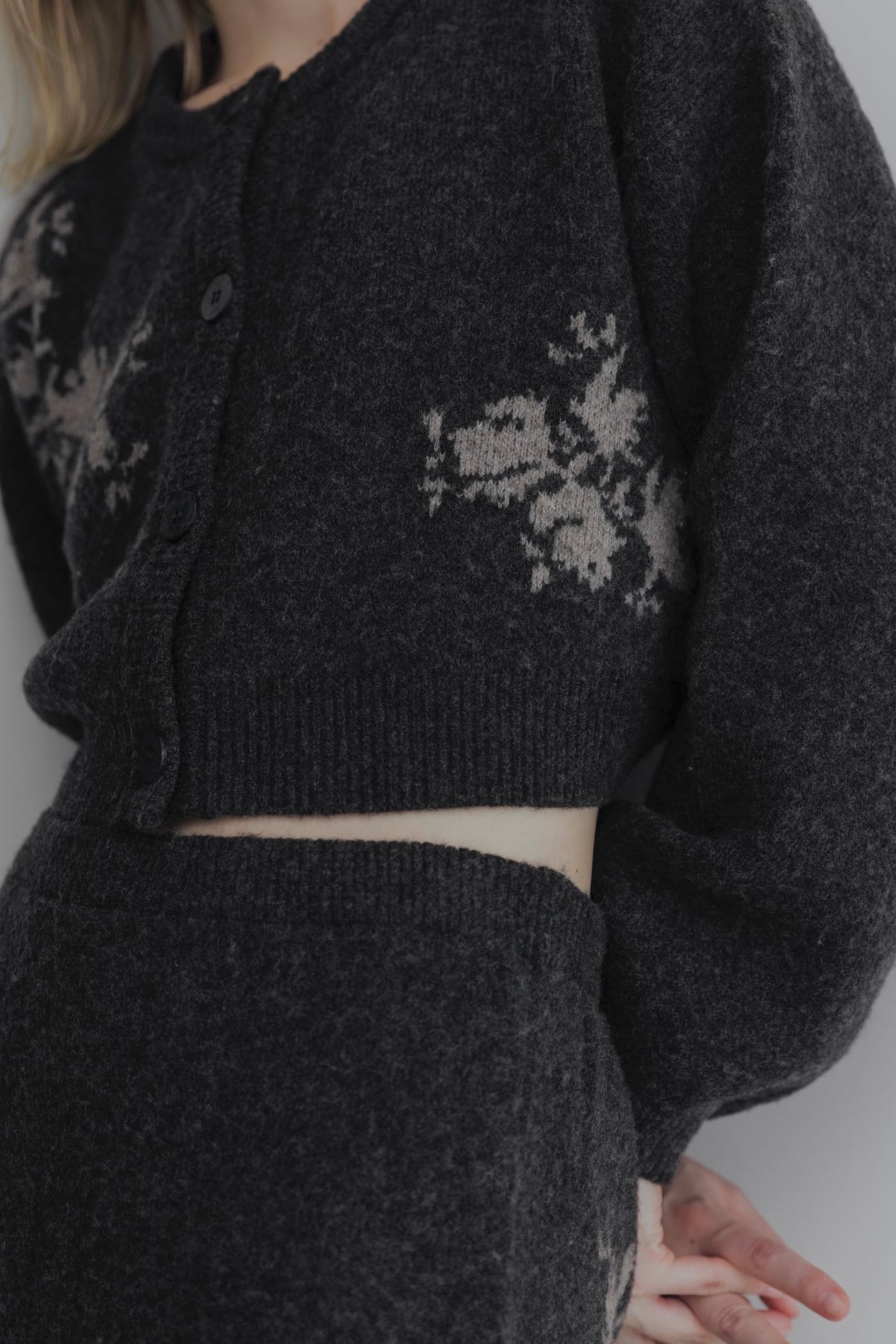 WILLFULLY cropped flower jacquard knit cardigan クロップドフラワージャガードニットカーディガン charcoal