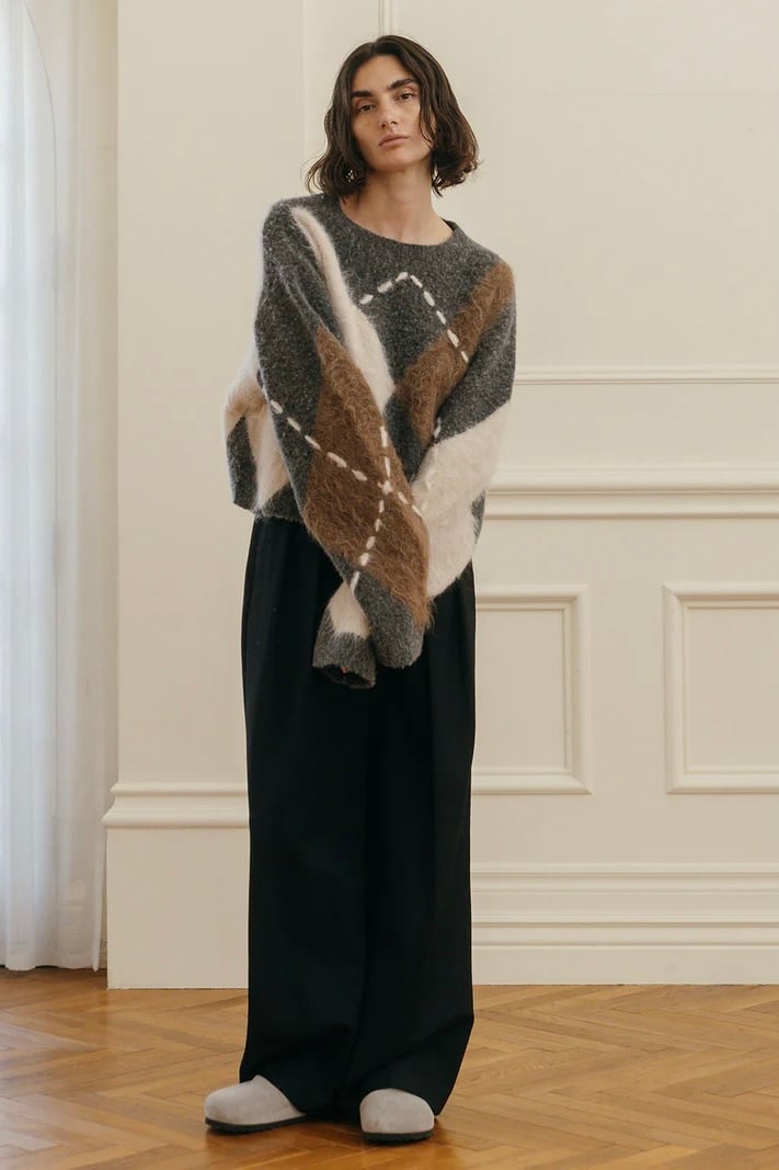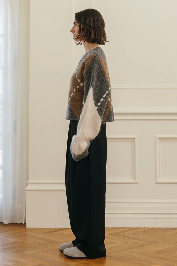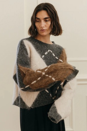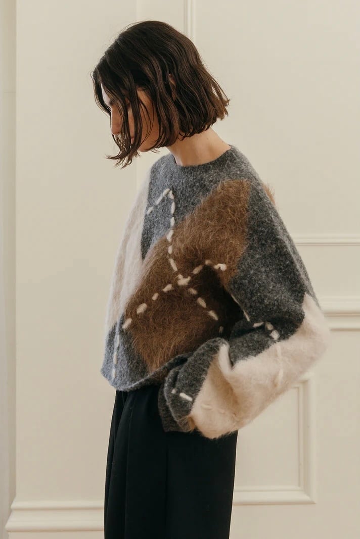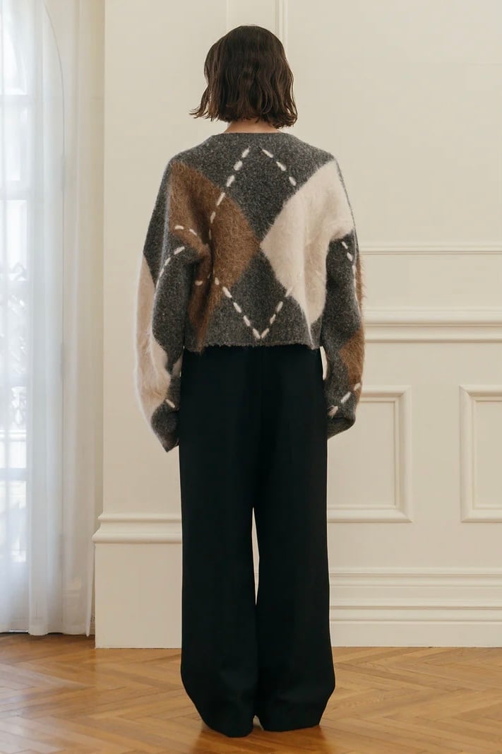 だからこそ、伝統の中に“今”の空気を纏わせた、素材の膨らみや陰影、糸の異なる艶感が交差することで、立体的でモダンなアーガイルに再構築。
