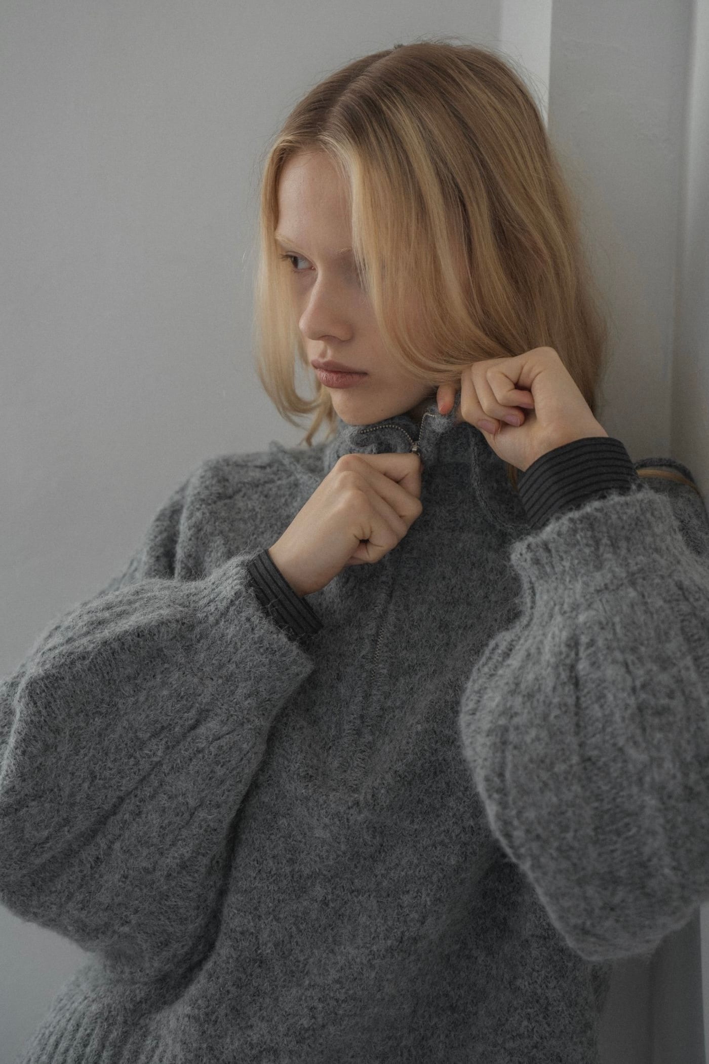 ・ウォームタッチなメランジ糸を使用したハーフジップニット