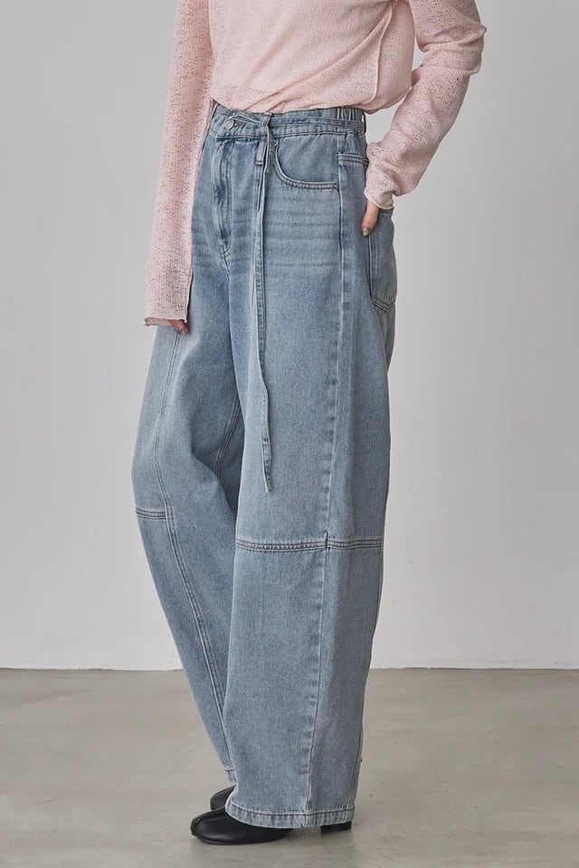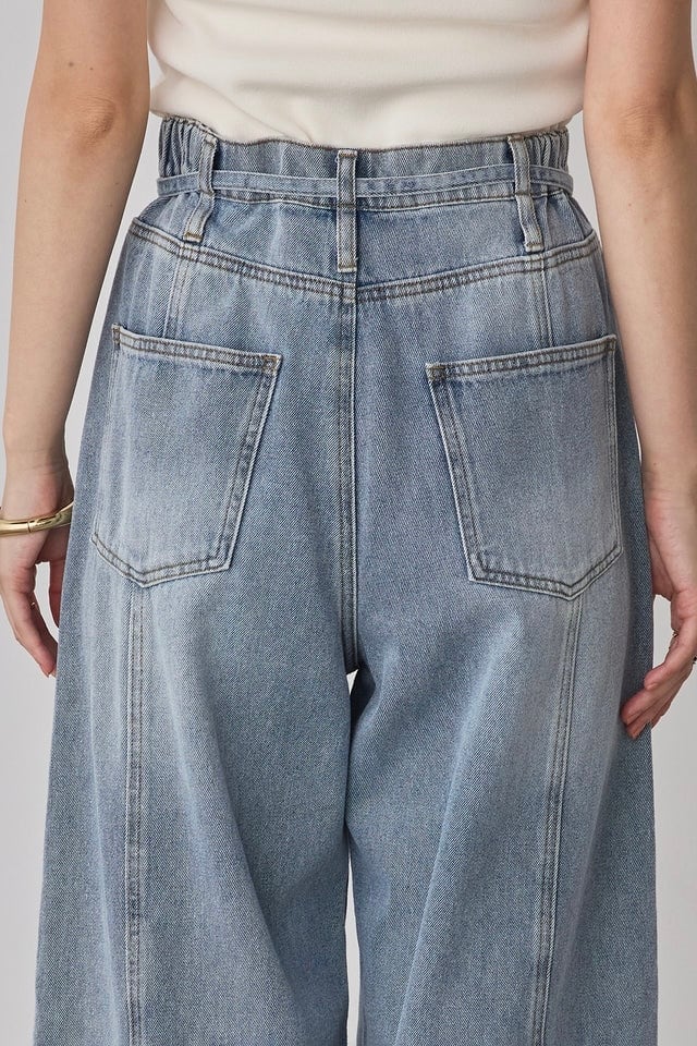 裾にかけてなだらかにカーブを描いた、バレルレッグシルエットデニムパンツ。