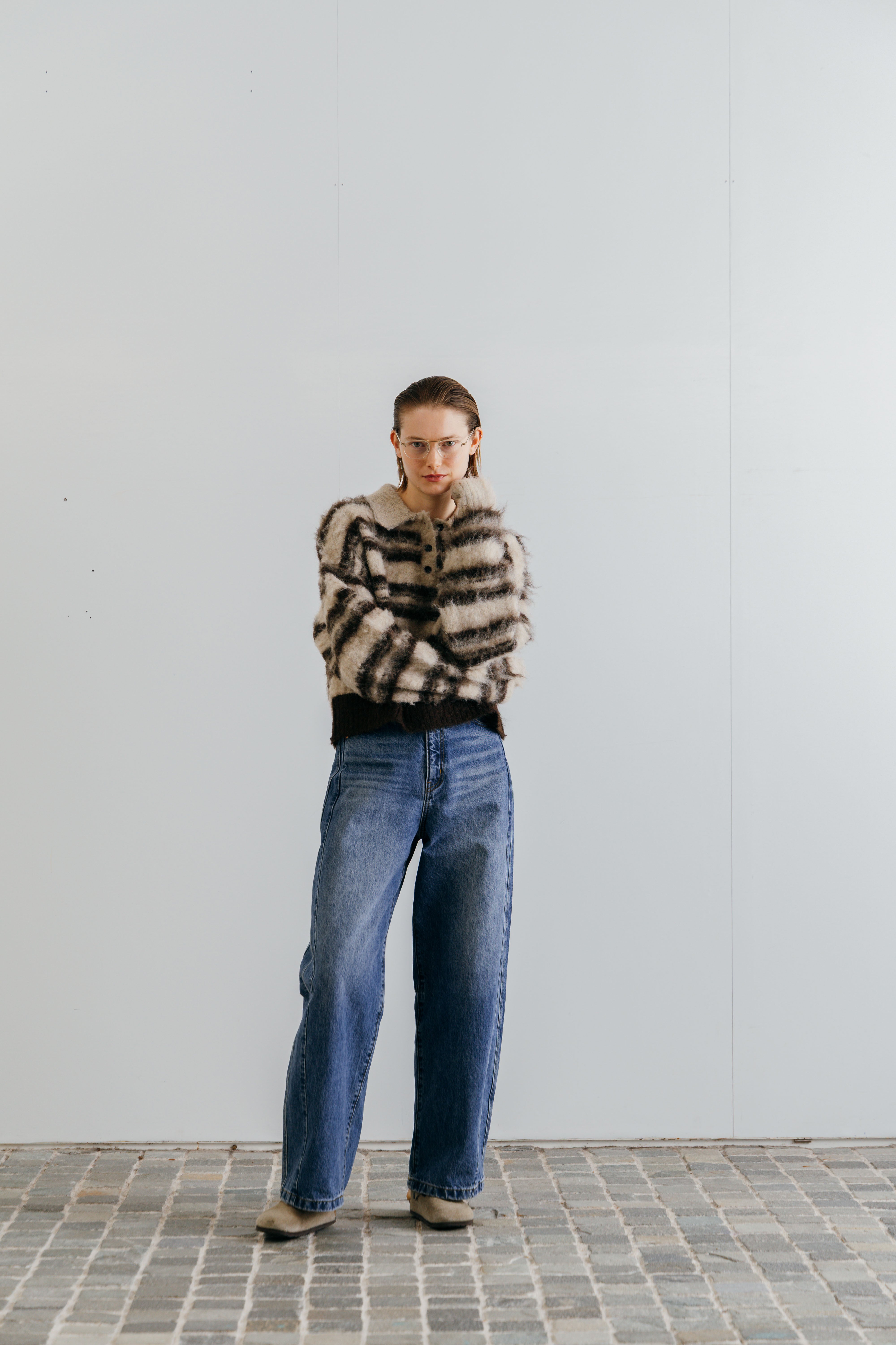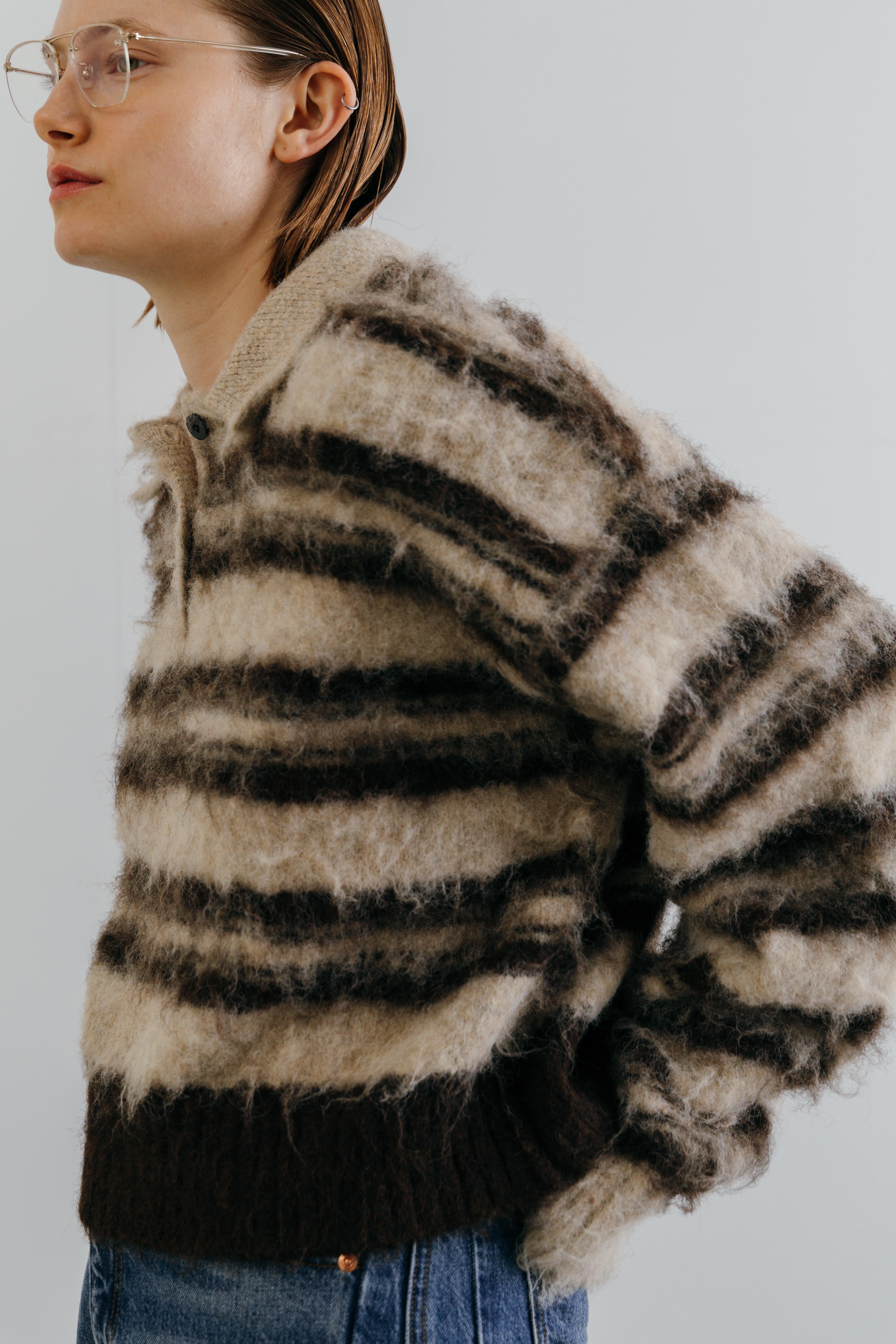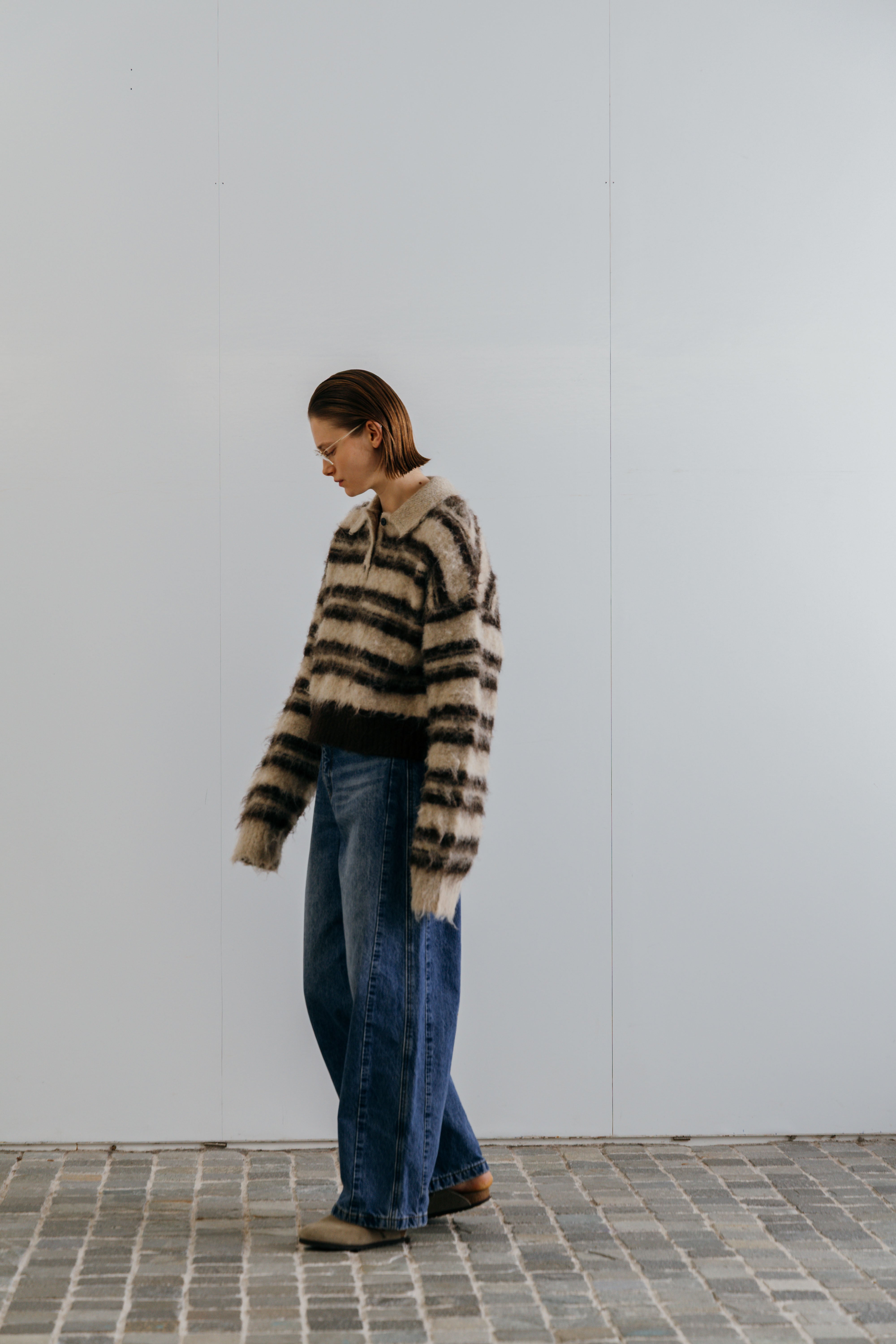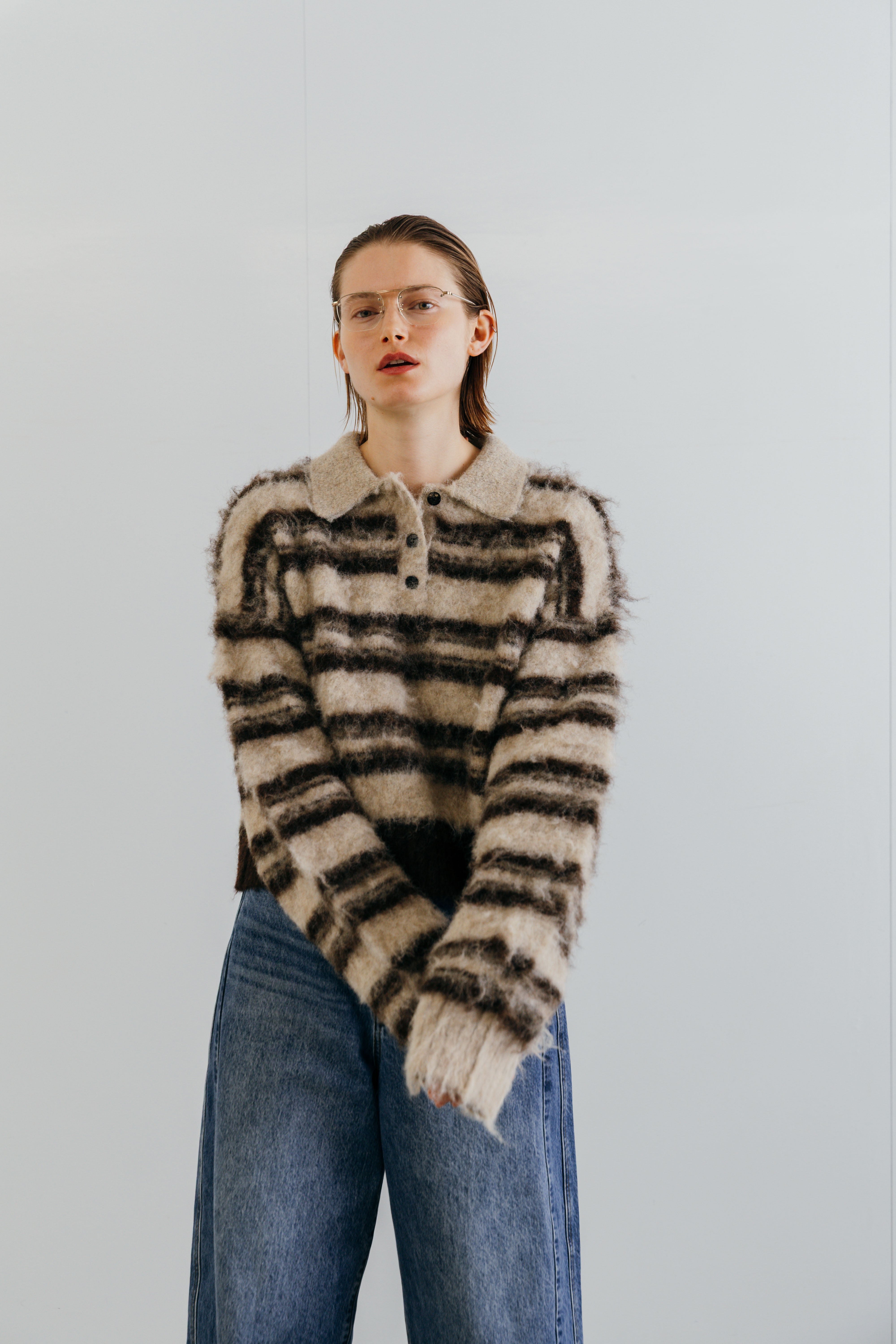 モヘアブレンド素材を使用した、起毛感のあるボーダーニットポロシャツ。