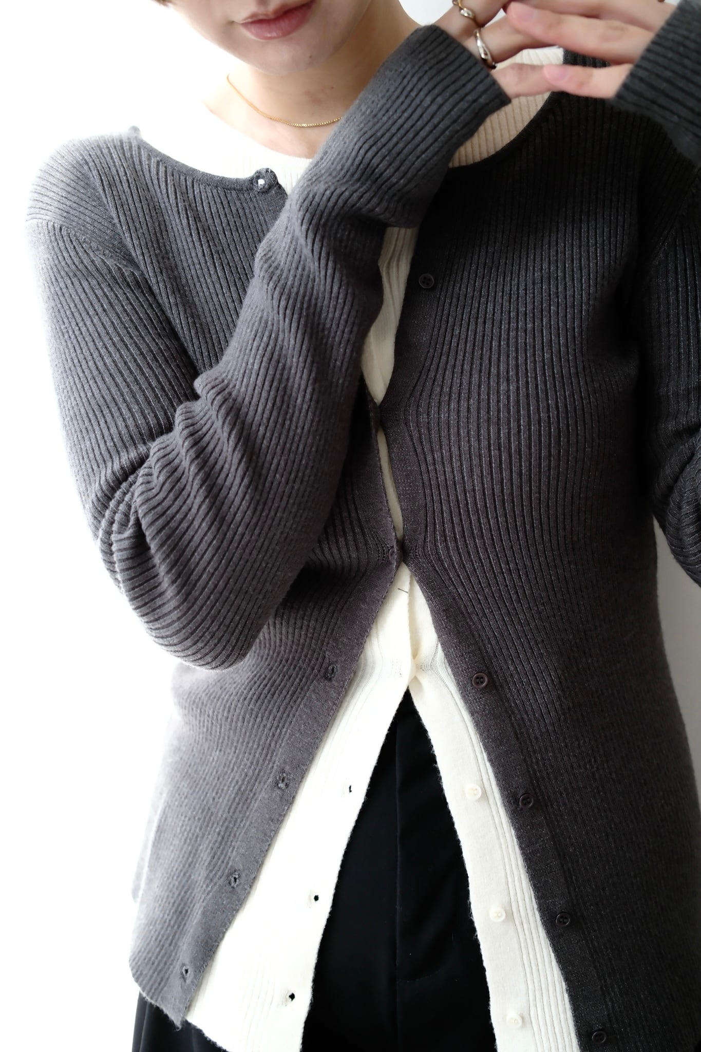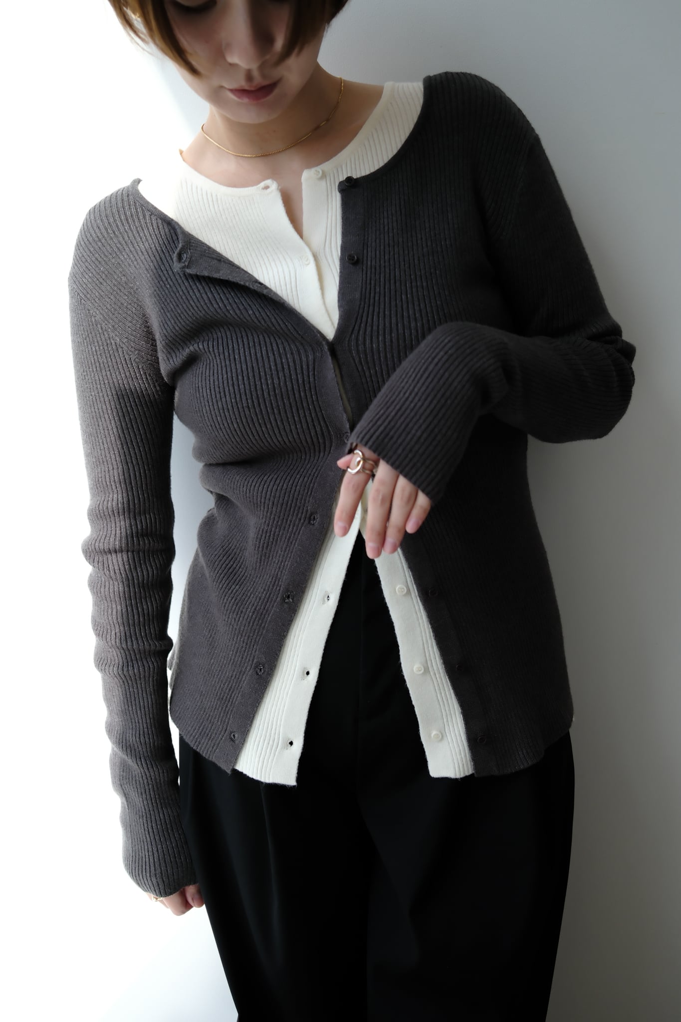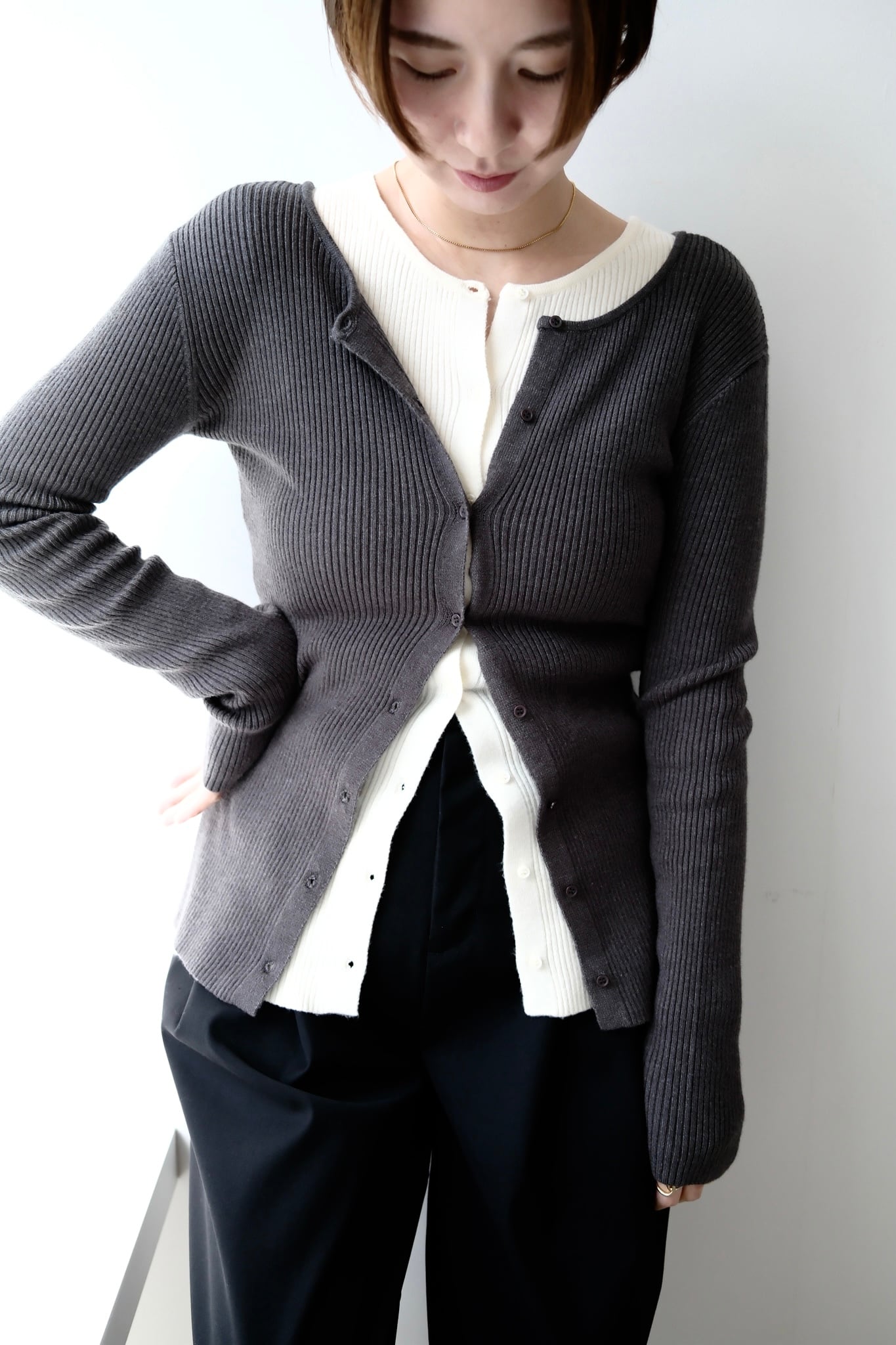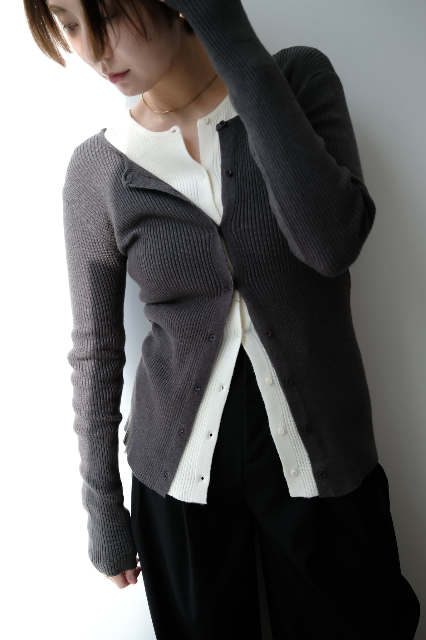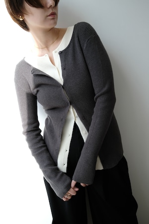 2WAY Rib Crew Neck Cardigan 前後2WAYリブ編みクルーネックカーディガン Charcoal