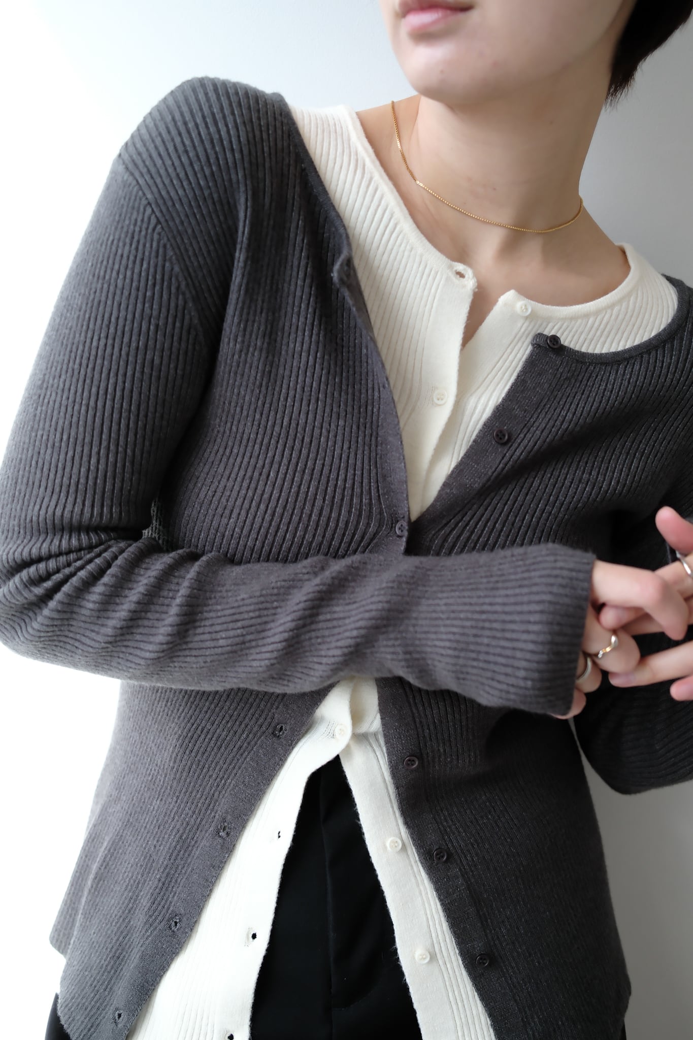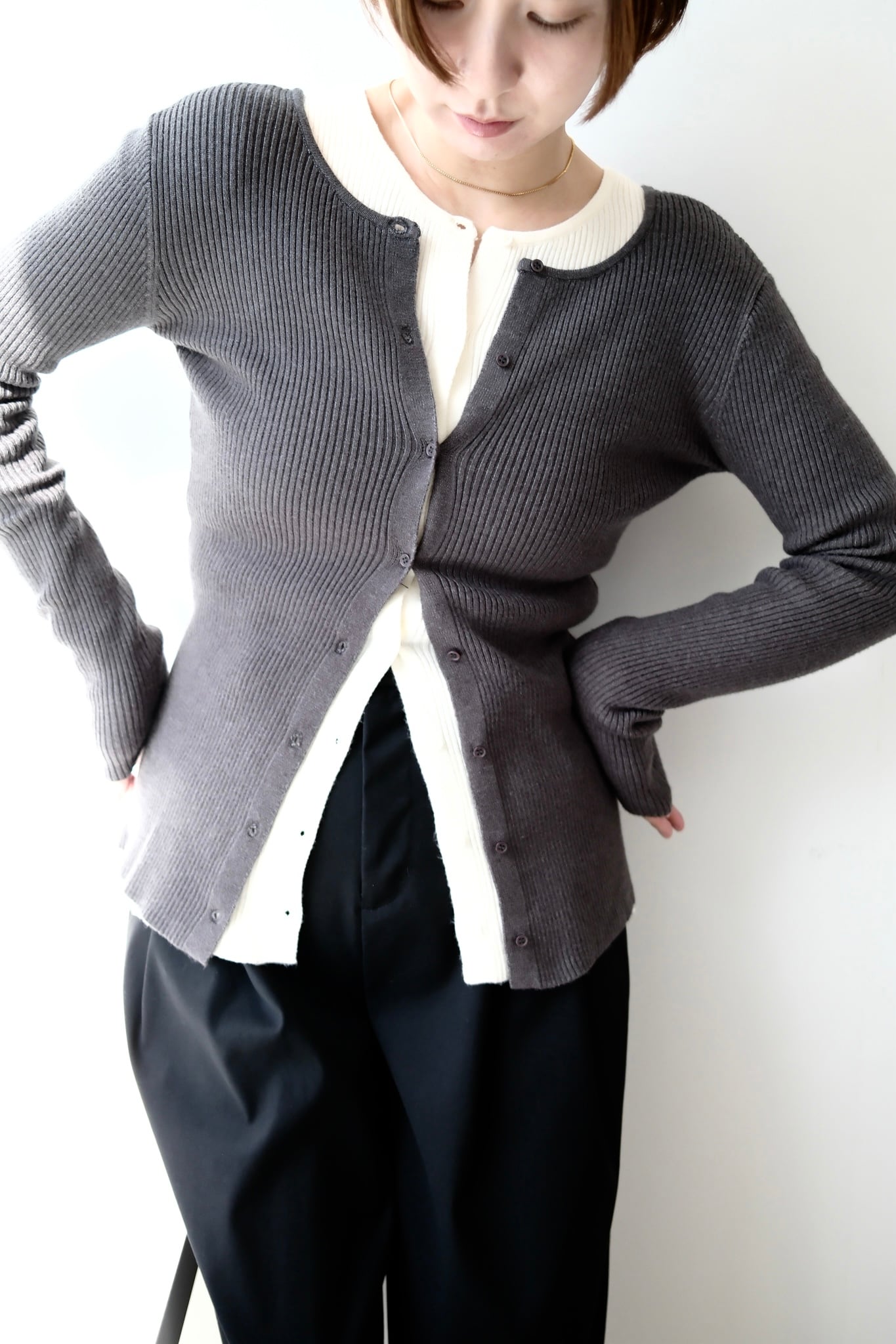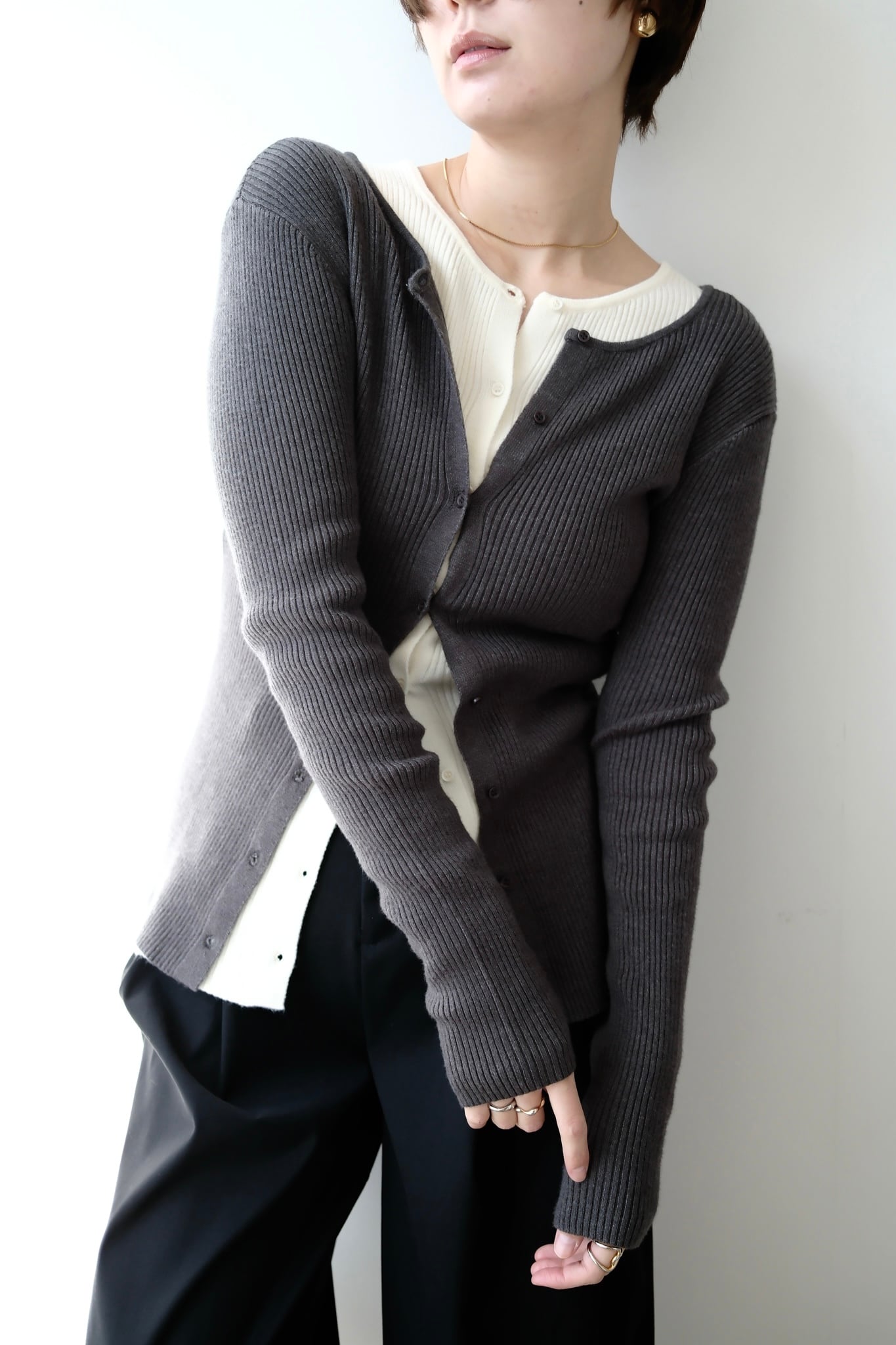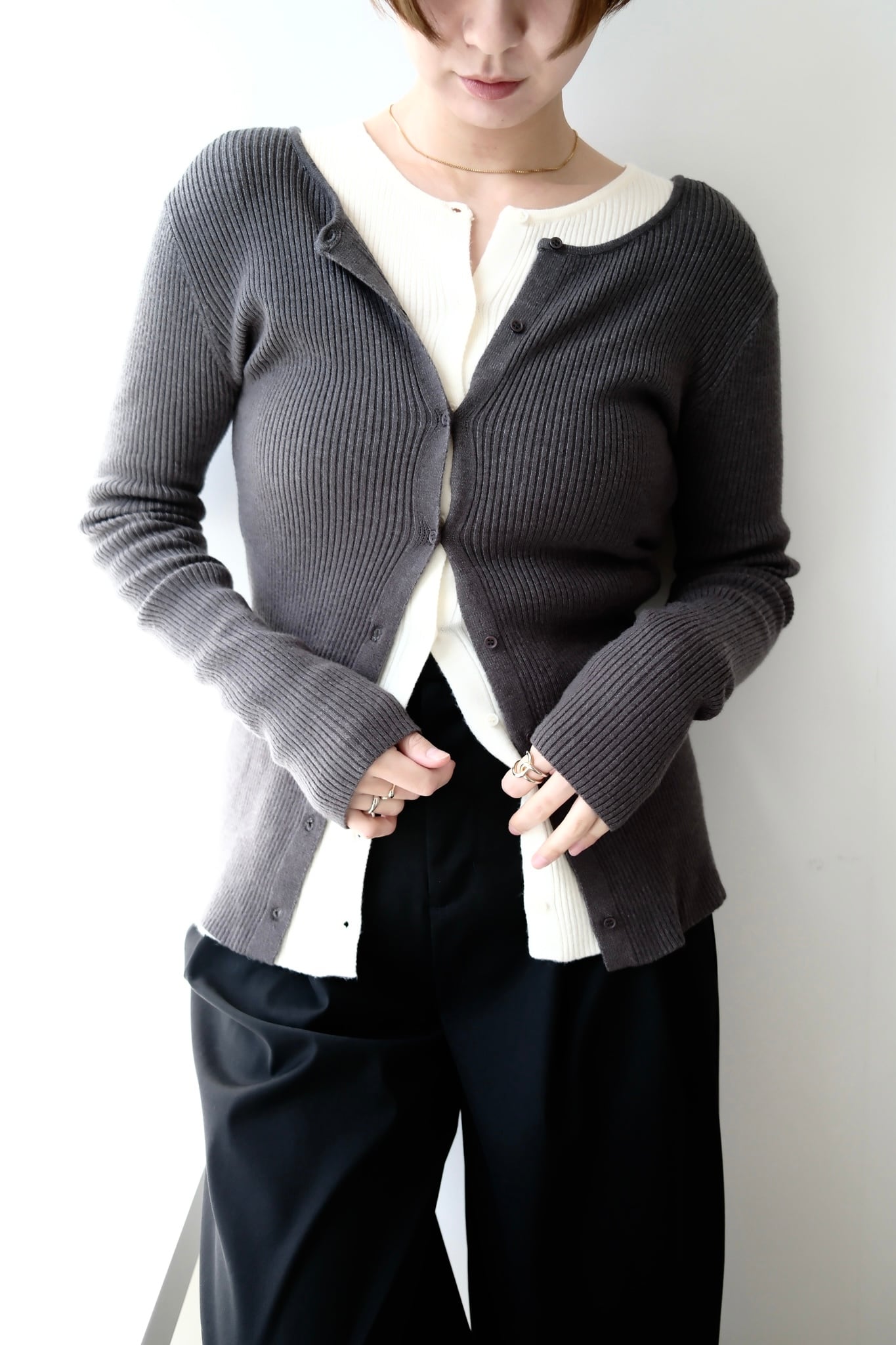 2WAY Rib Crew Neck Cardigan 前後2WAYリブ編みクルーネックカーディガン Charcoal