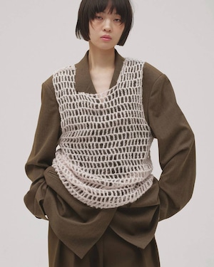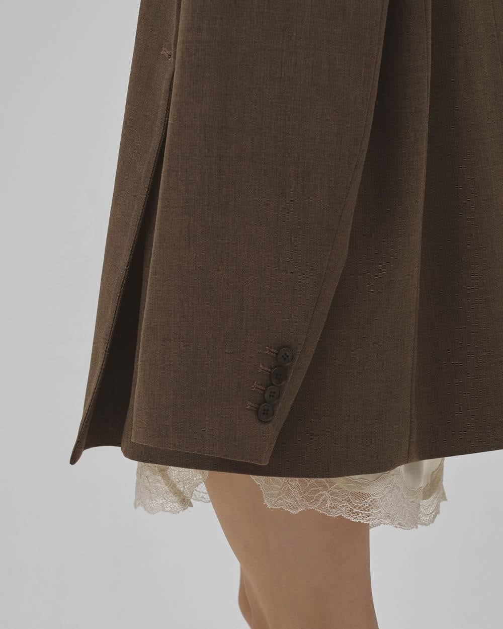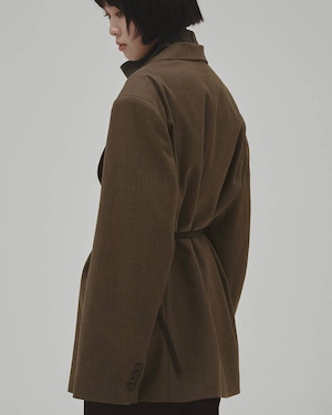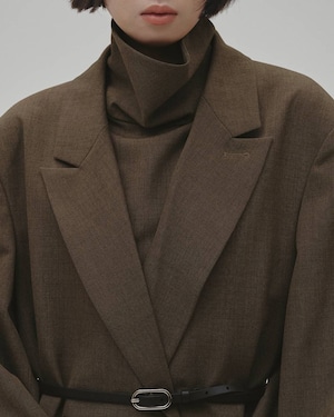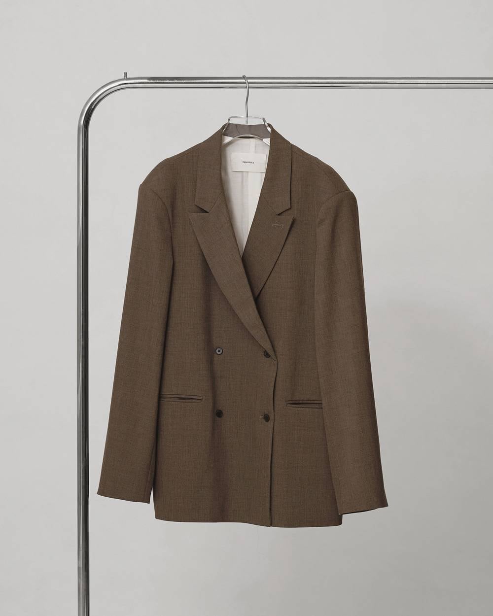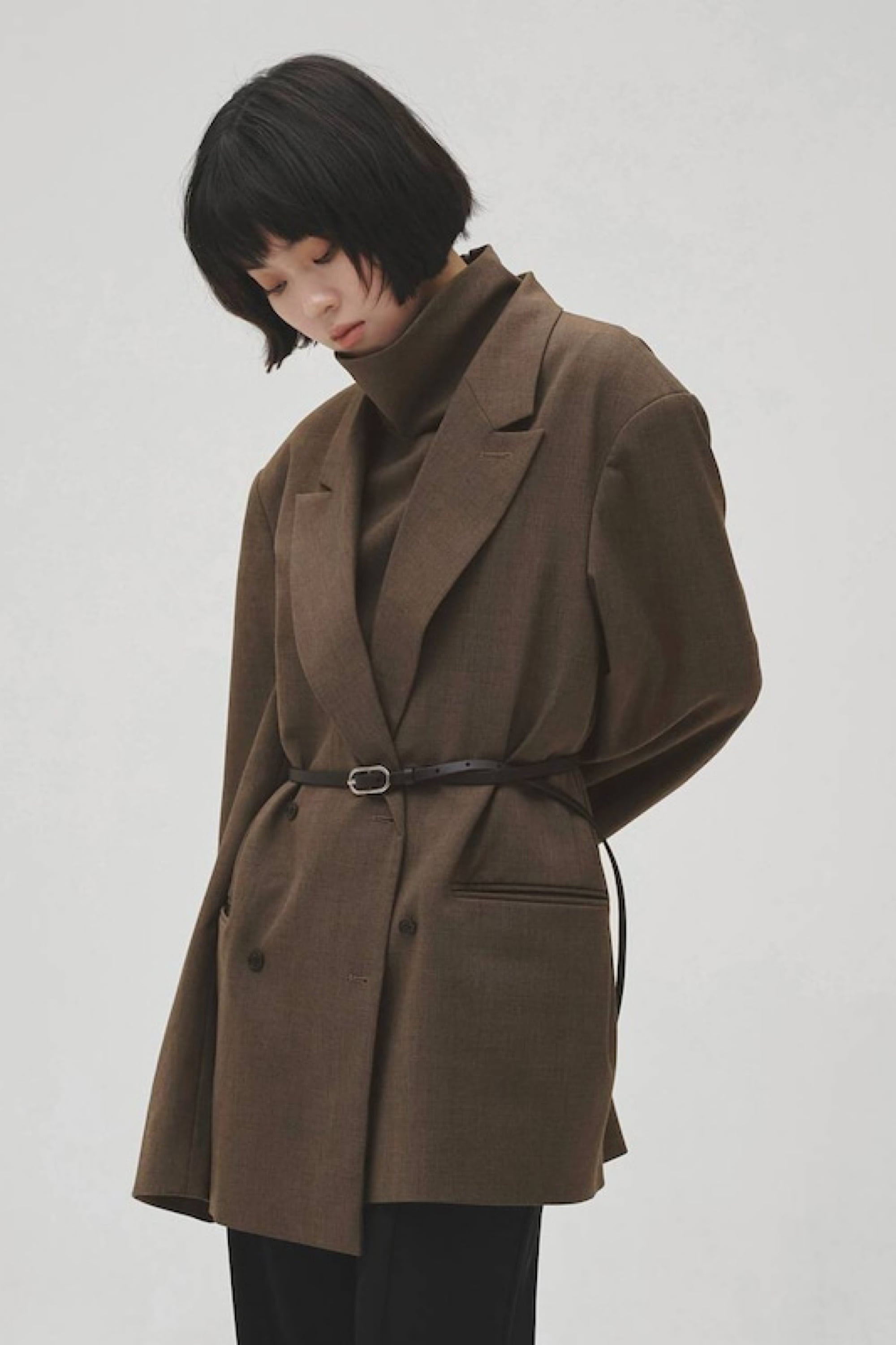 ウール混の上質なツイル生地を使用したジャケット。華奢なボタンを配したダブル仕様と、オーバーショルダーのシルエットが洗練された雰囲気を引き立てます。シンプルなボトムスに合わせるだけで、マニッシュなスタイリングが完成する一枚。同素材のTwill Turtle Topsを合わせた着こなしもおすすめです。