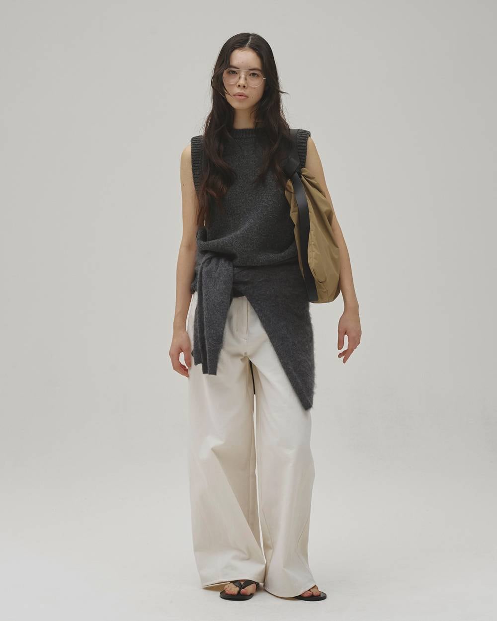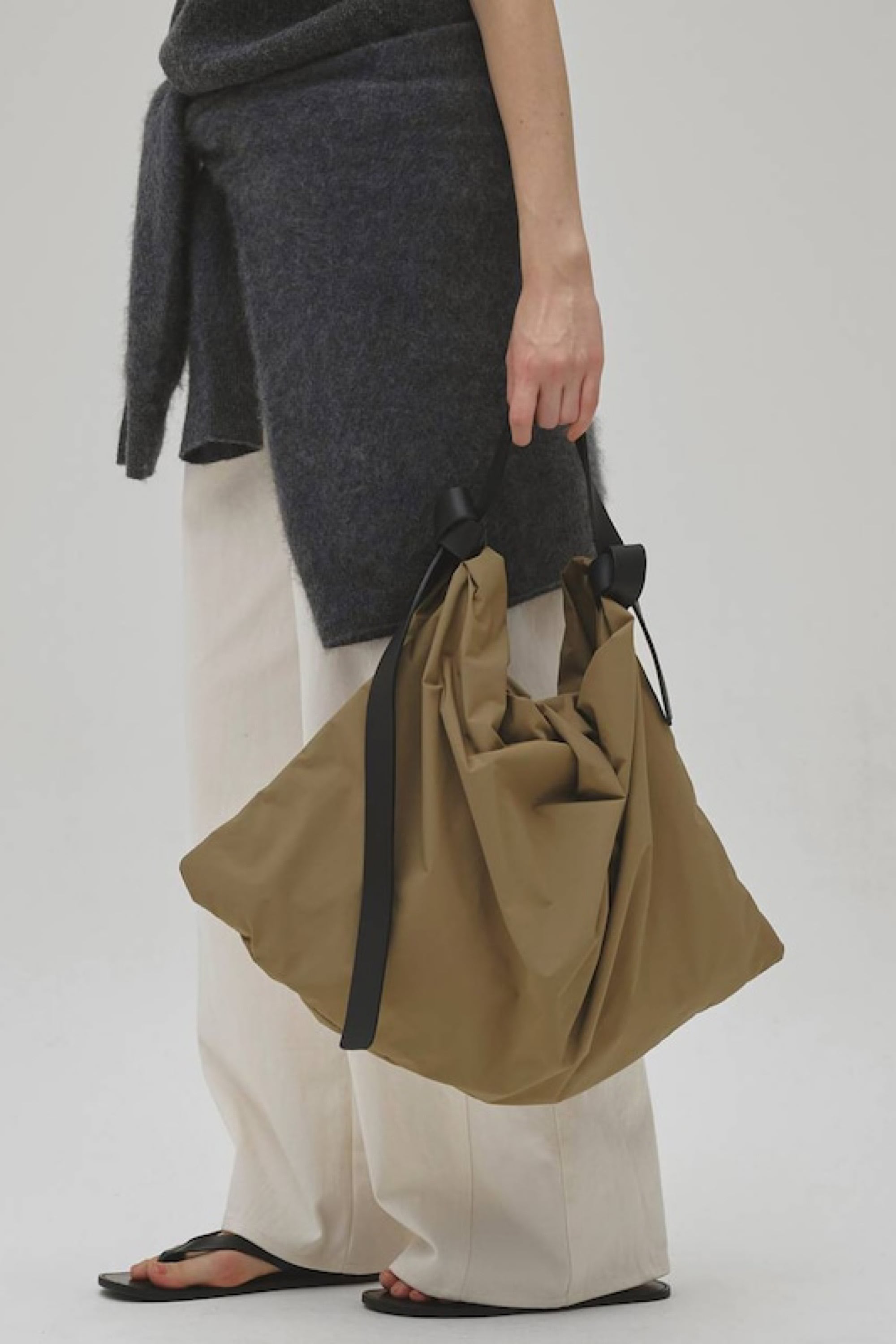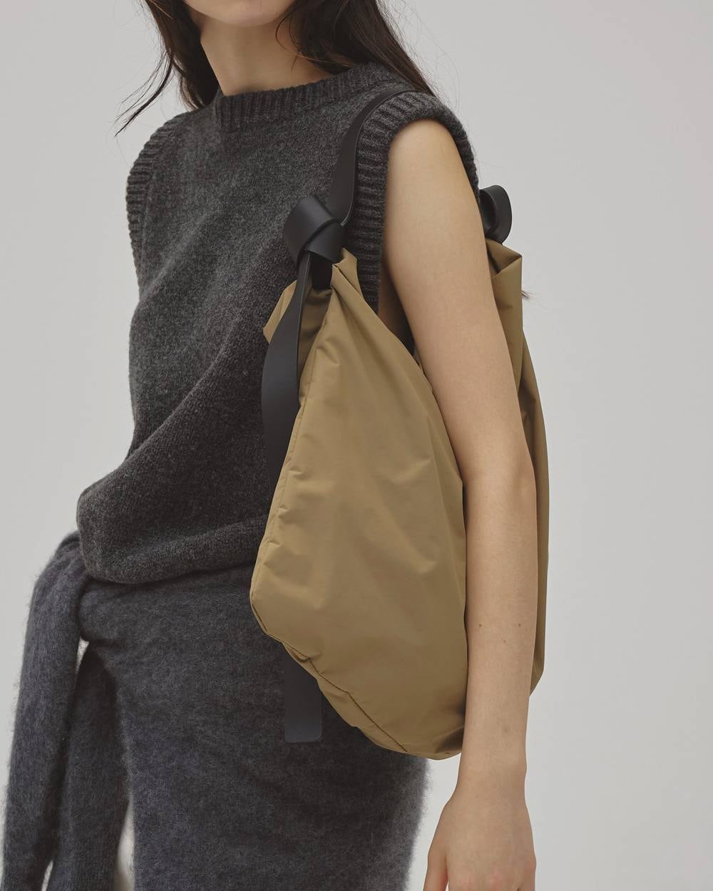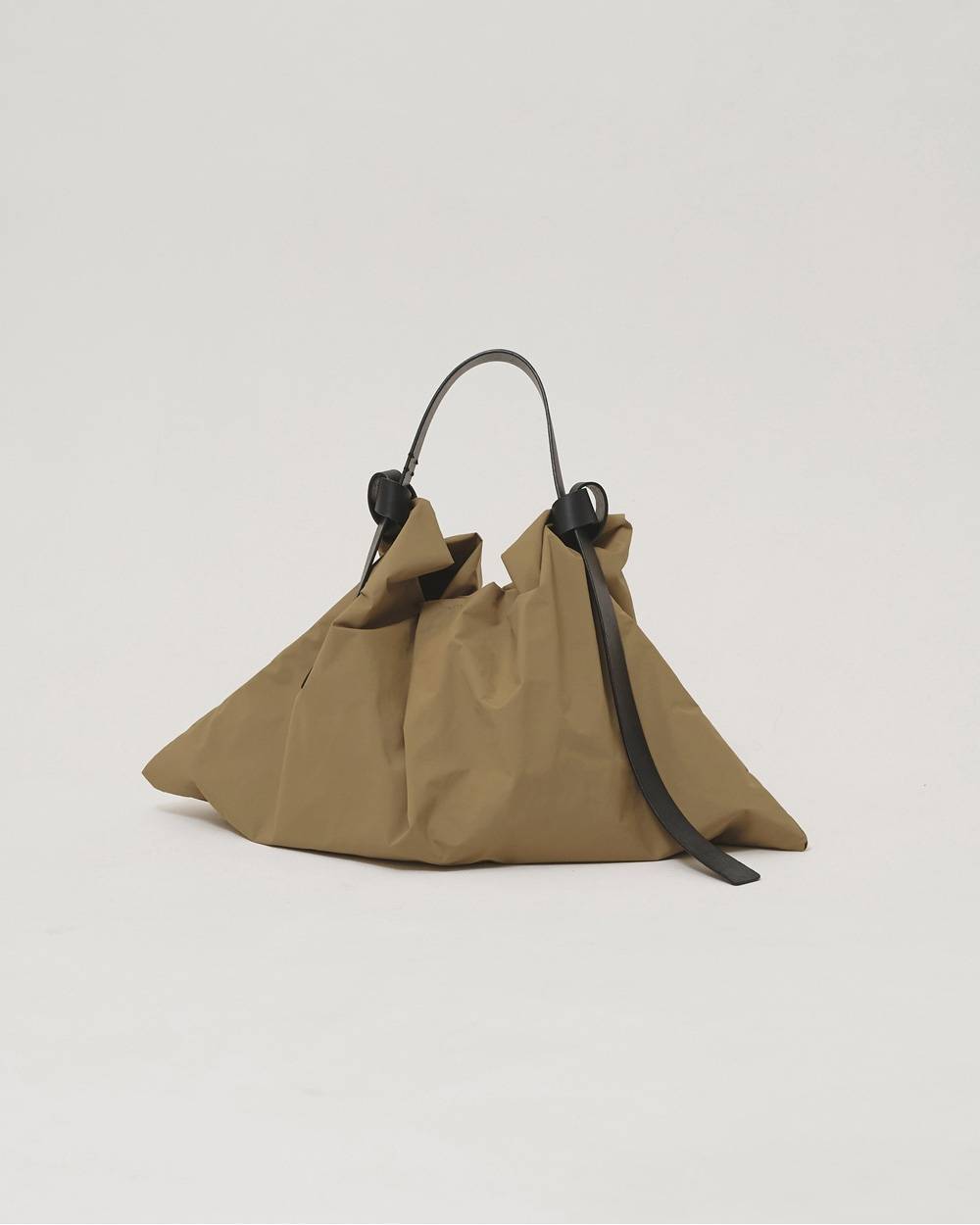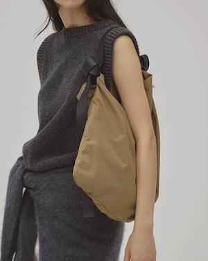 ナイロンタフタ生地を使用したボディに、上質な国内牛革ベルトを組み合わせたバッグ。アシンメトリーな長さのレザーベルトが特徴で、片側に施した飾りステッチがさりげないアクセントに。ベルトは取り外し可能な仕様。A4サイズがすっきり収まる大容量で、内ポケット付き。軽やかな素材感でデイリーにはもちろん、レジャーシーンにも活躍。汚れた際には、ベルトを外して軽く洗うことも可能です。