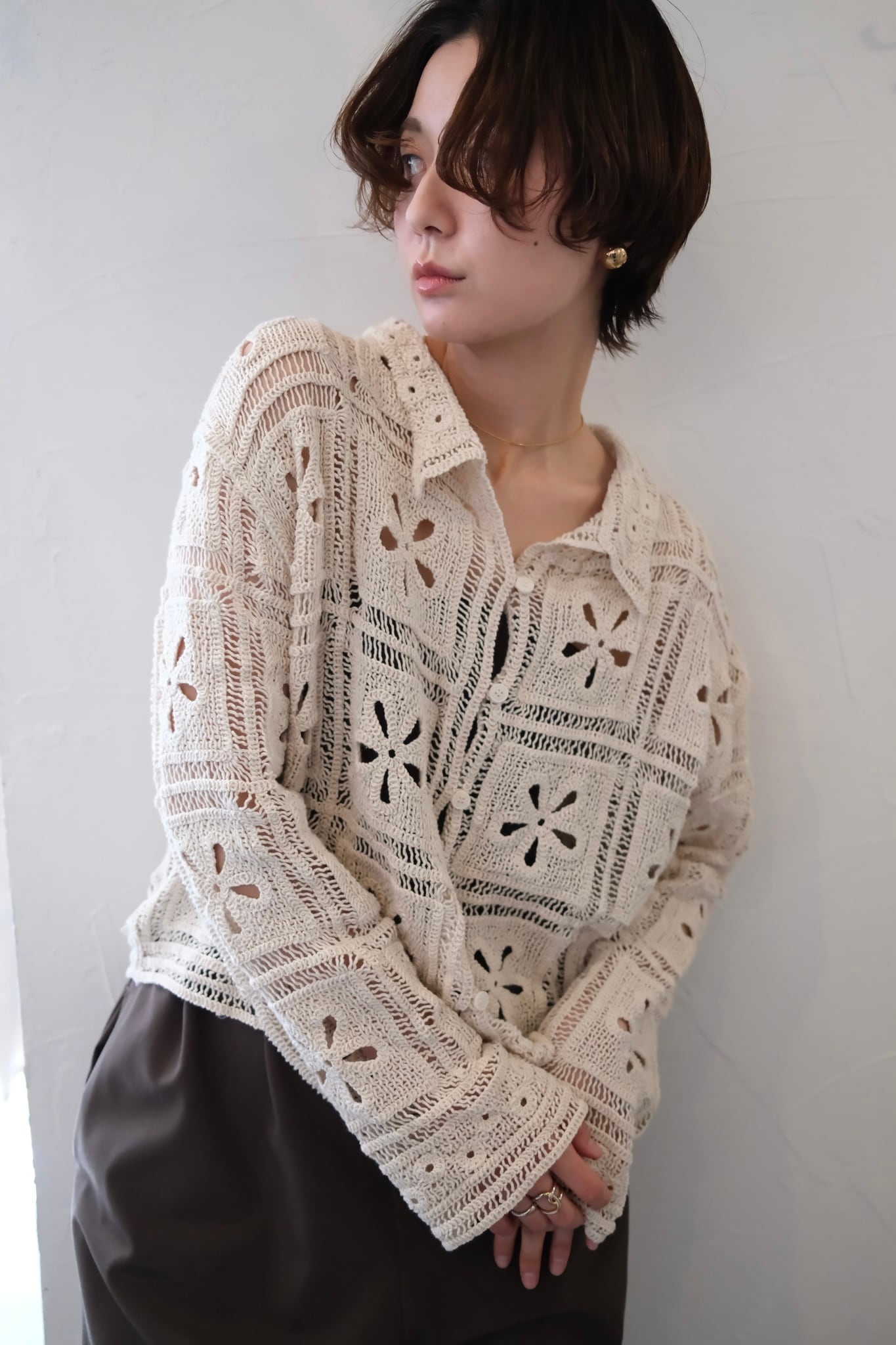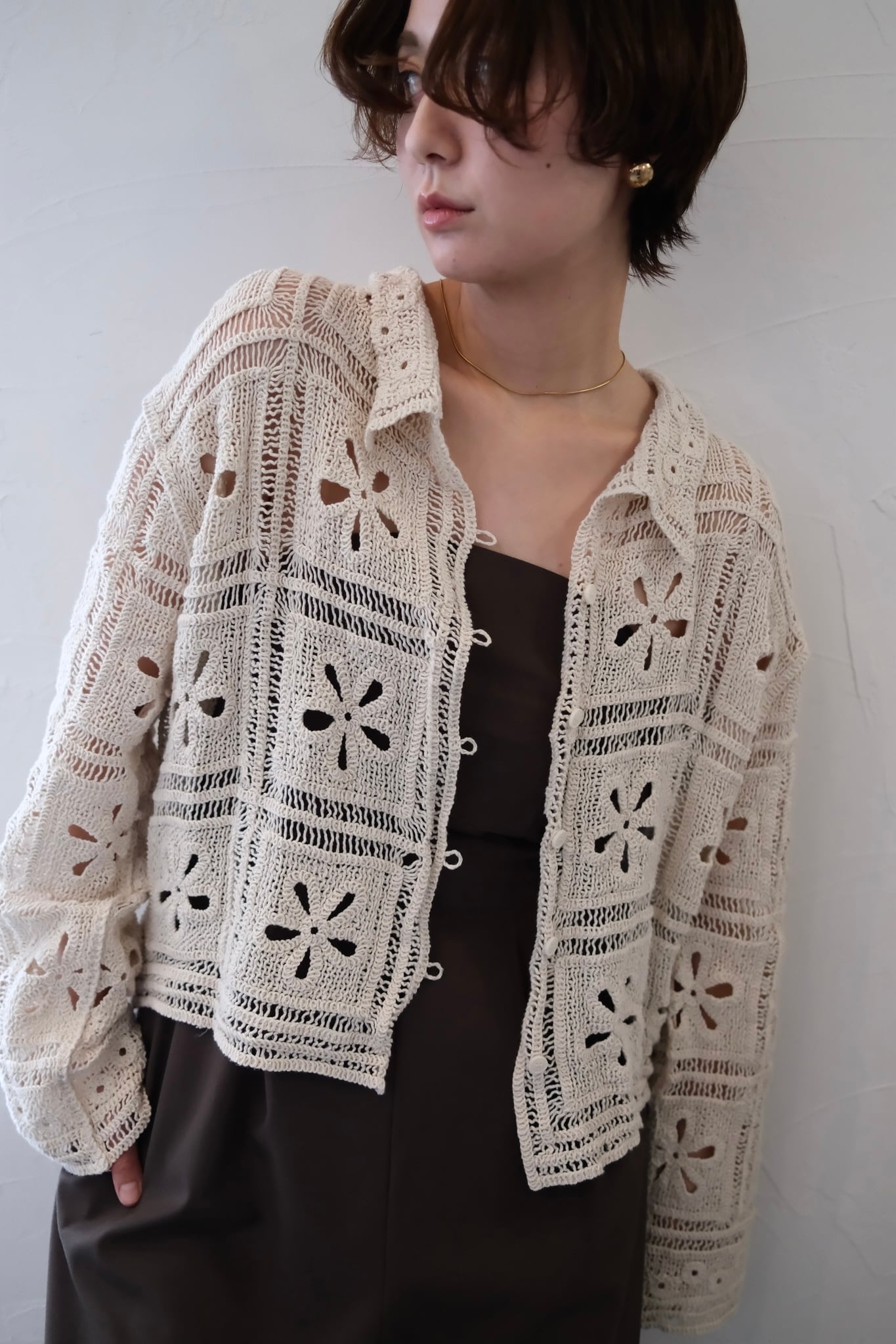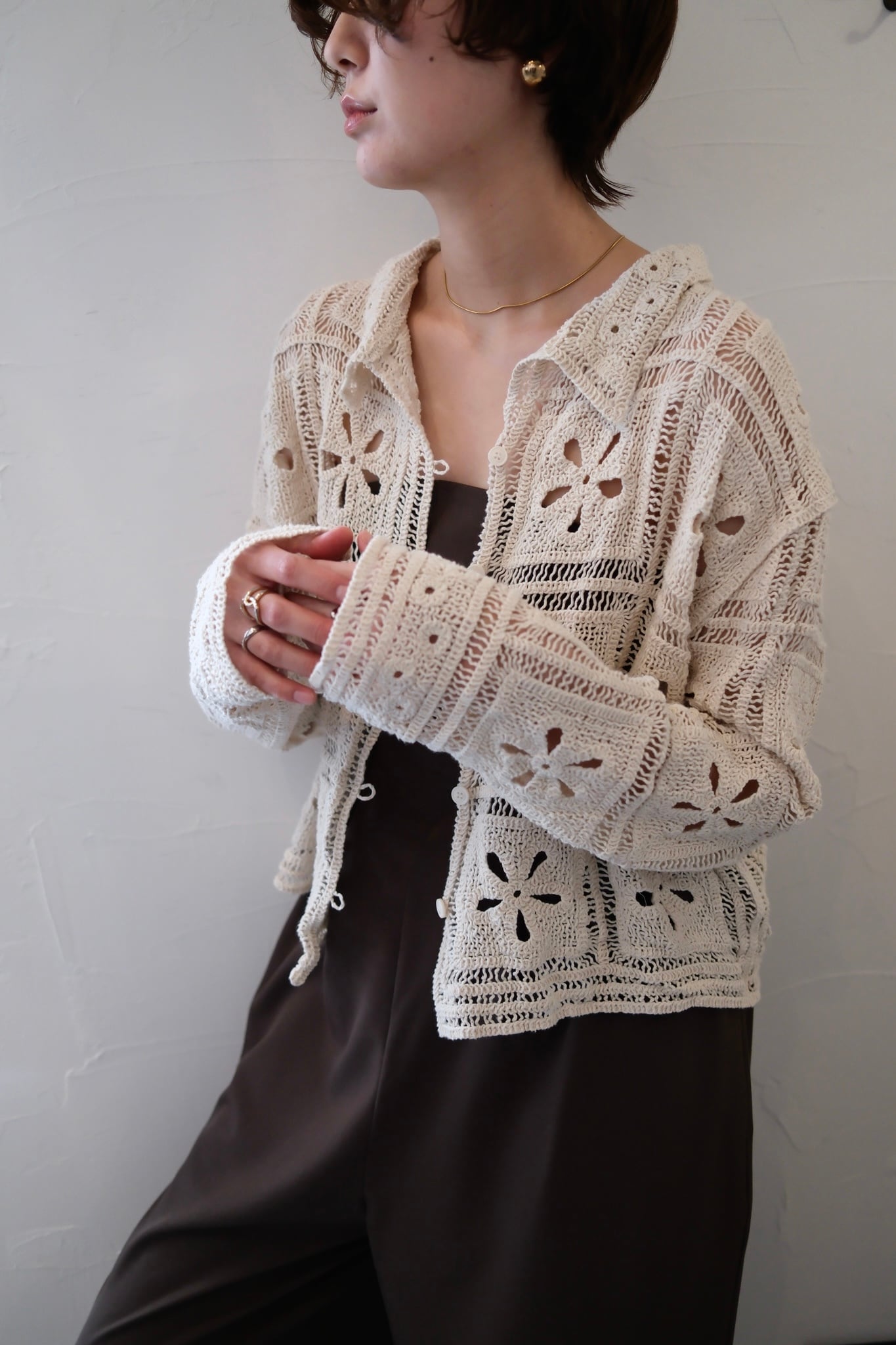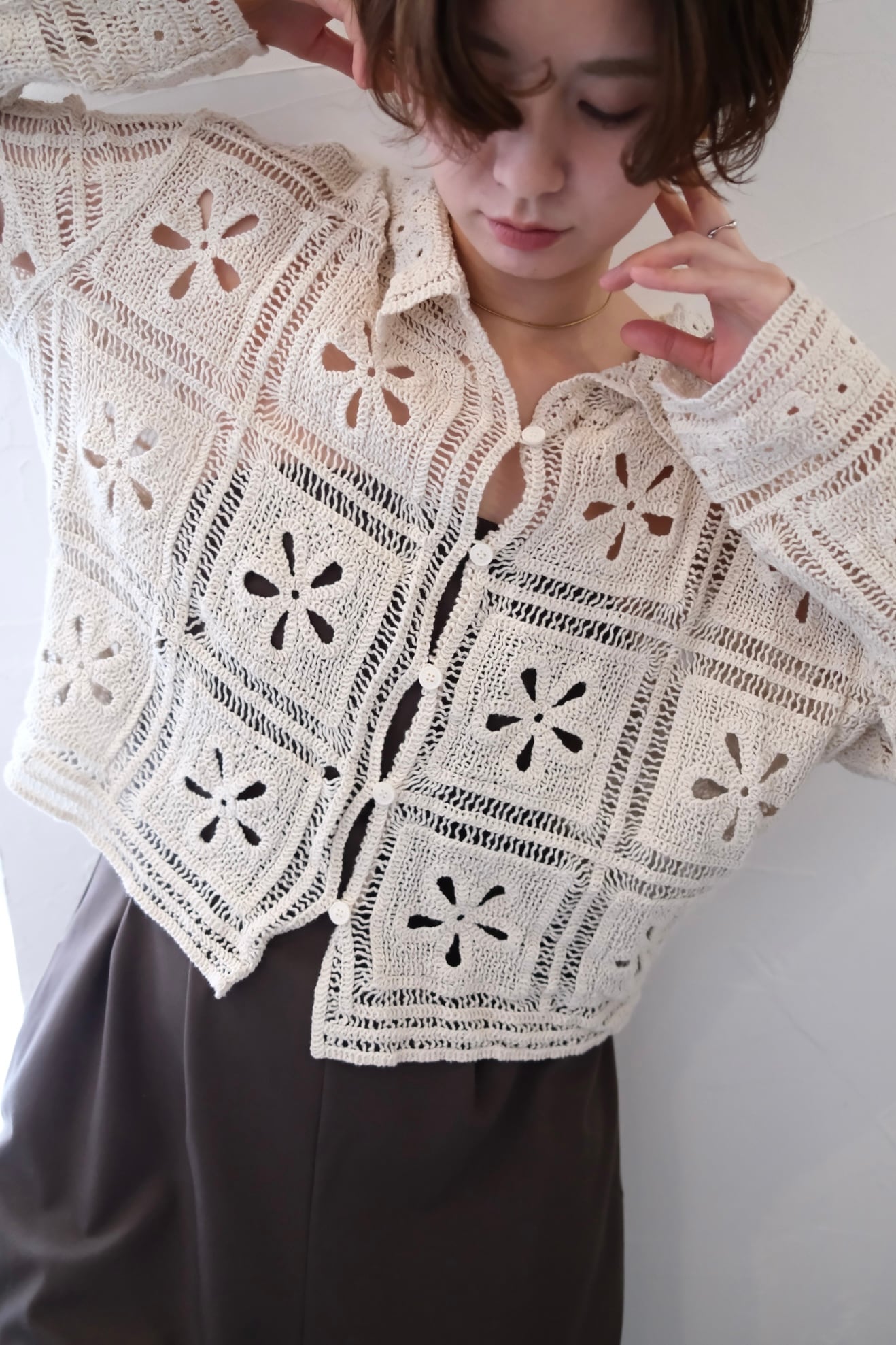 繊細なカギ編み柄が春らしい表情を引き立てる、ニットカーディガン。甘くなりすぎないスクエア調の編み柄で、大人フェミニンに仕上げました。程よくコンパクトな丈感は、ワイドパンツやスラックスとも相性抜群。羽織りとしてはもちろん、前を留めてトップス風に着るのもおすすめ。