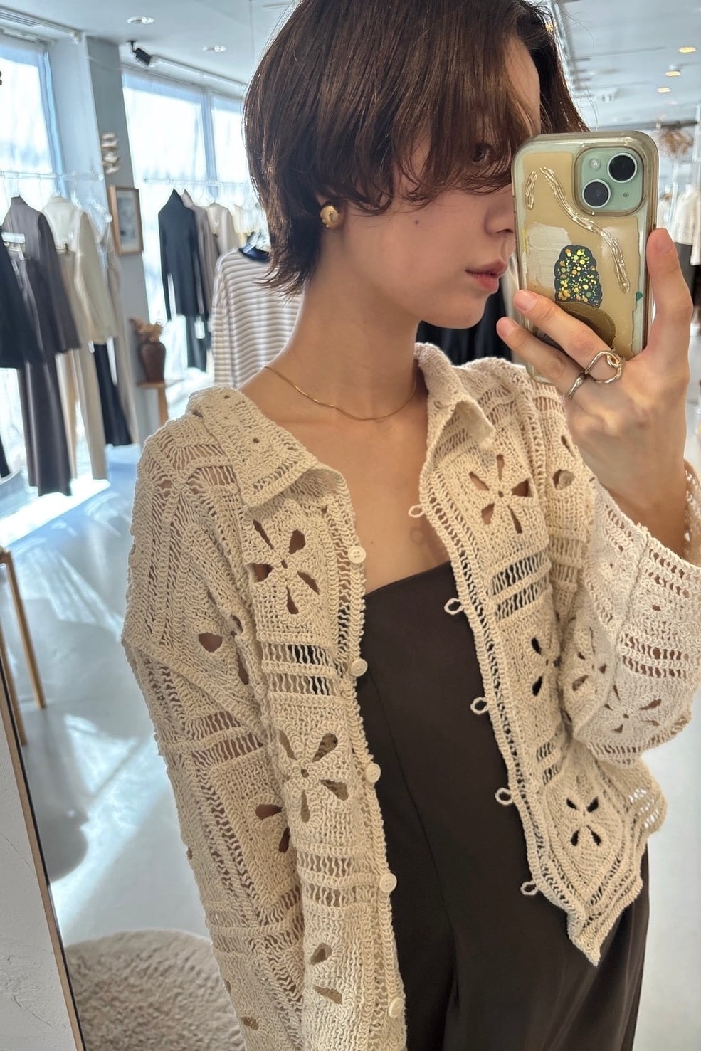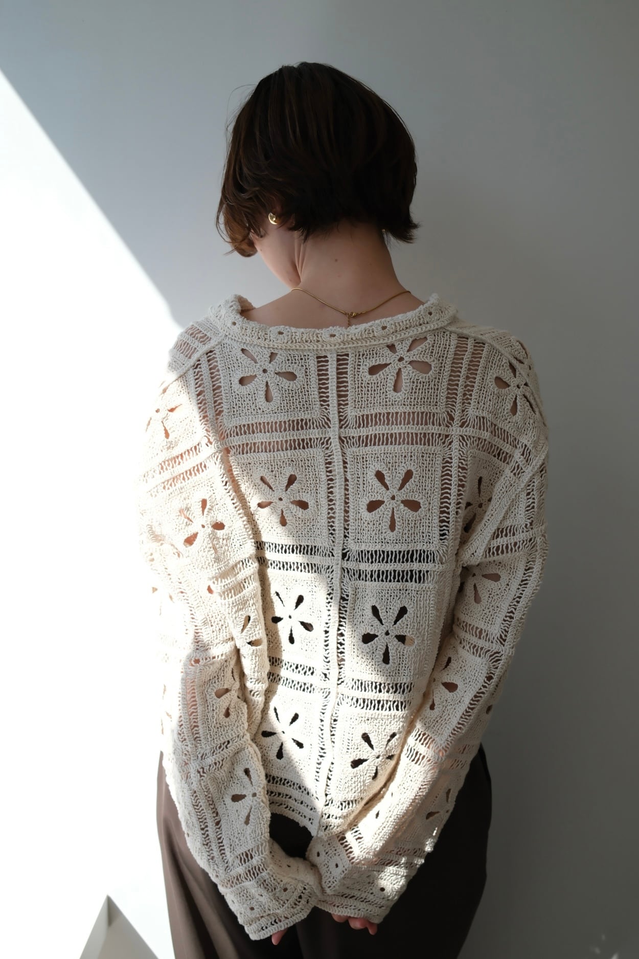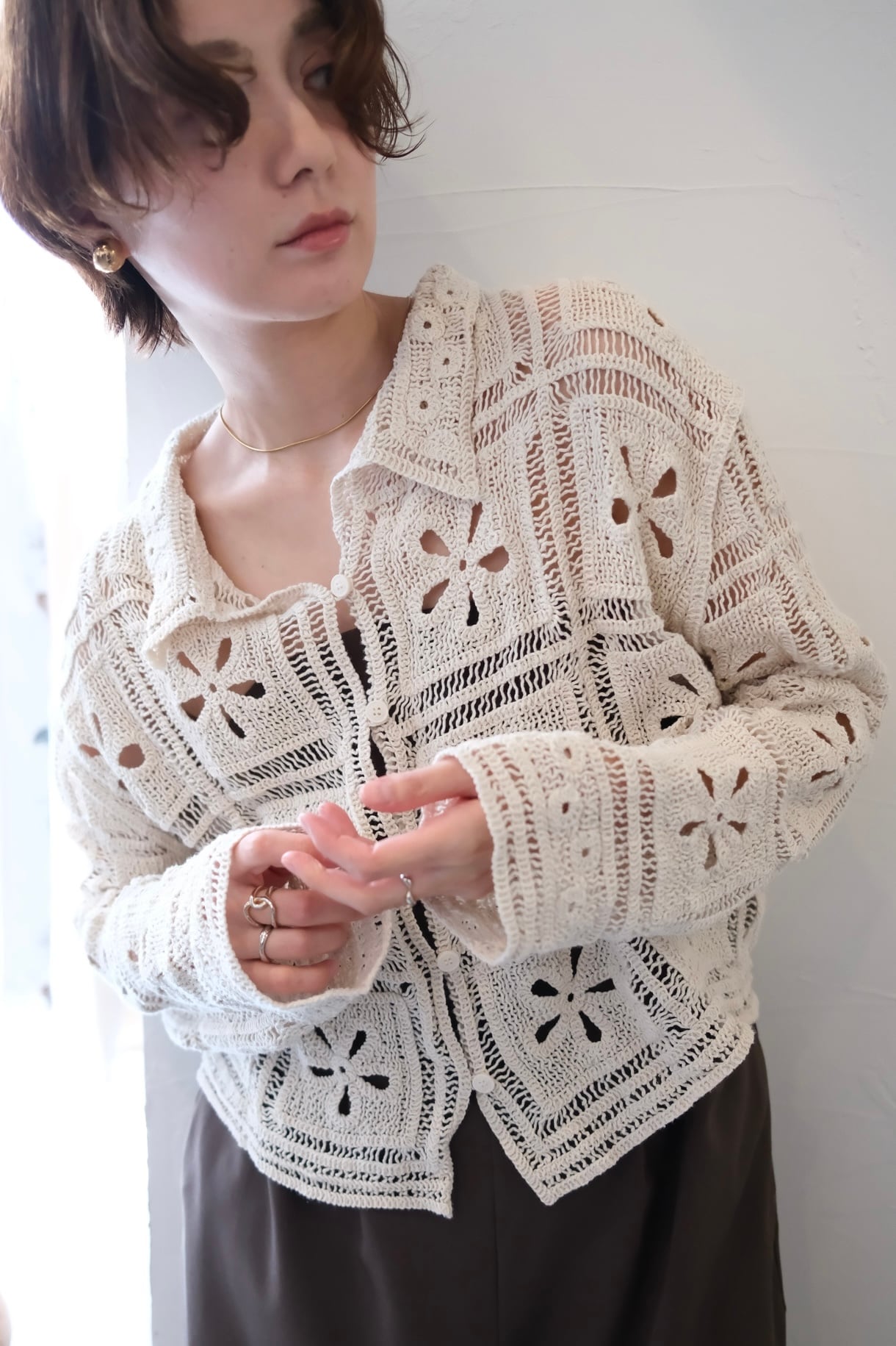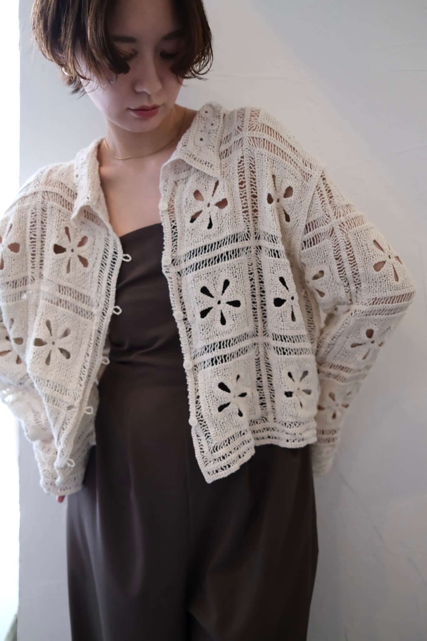 繊細なカギ編み柄が春らしい表情を引き立てる、ニットカーディガン。甘くなりすぎないスクエア調の編み柄で、大人フェミニンに仕上げました。程よくコンパクトな丈感は、ワイドパンツやスラックスとも相性抜群。羽織りとしてはもちろん、前を留めてトップス風に着るのもおすすめ。