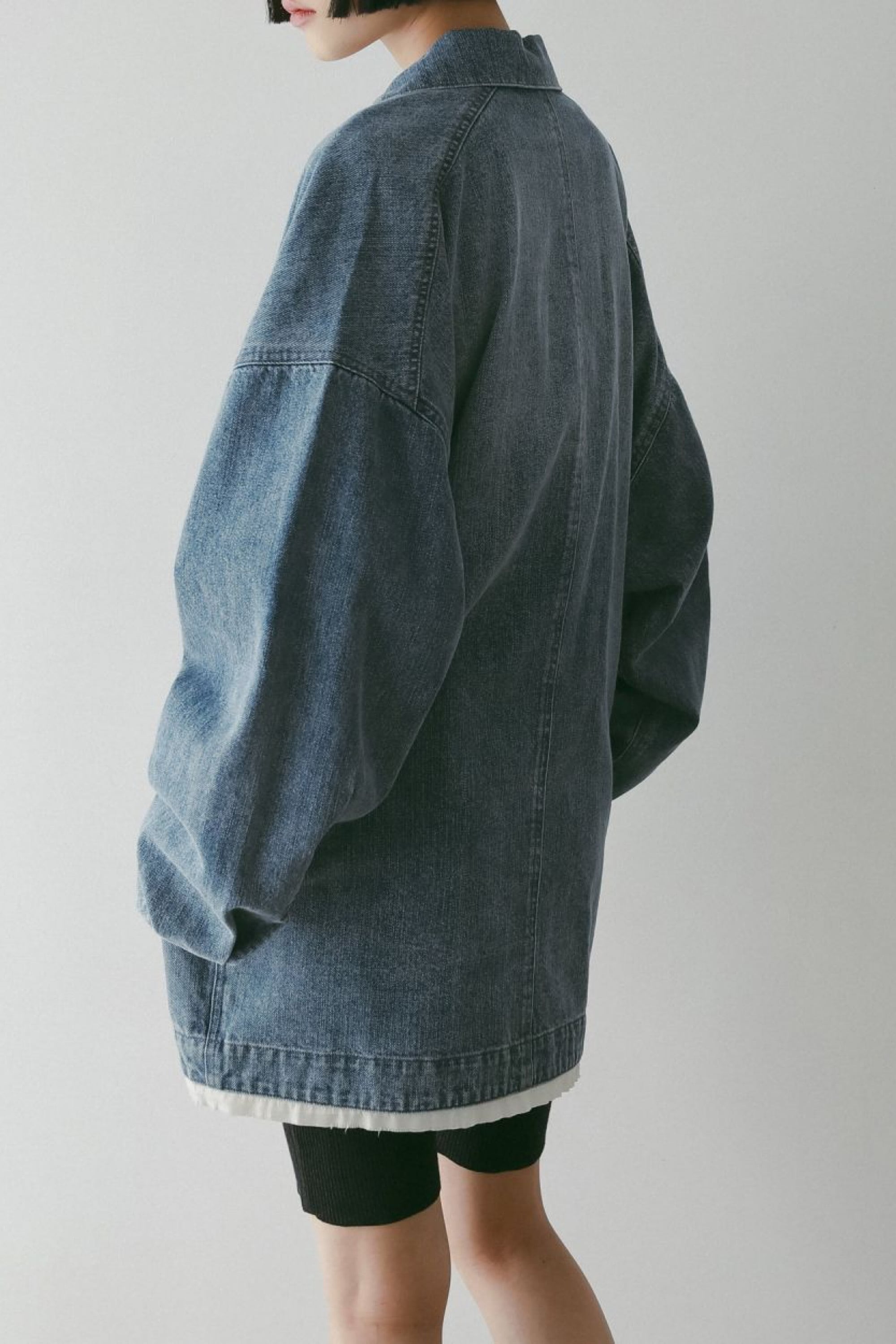 ワークジャケットをベースにオーバーに仕上げたデニムジャケット。ブルーは色落ちさせたブルーカラーに、微かにベージュのオーバーダイをすることで、ヴィンテージライクな色合いに仕上げました。ブラックはブラックデニムにウォッシュをかけ、程良い加工感を出しています。袖口と裾にカットオフされた別布を重ねているのがポイント。シンプルな胸ポケットと脇ポケット付きで、フラットなフロントデザインが着回し易く、軽く羽織れる一枚です。