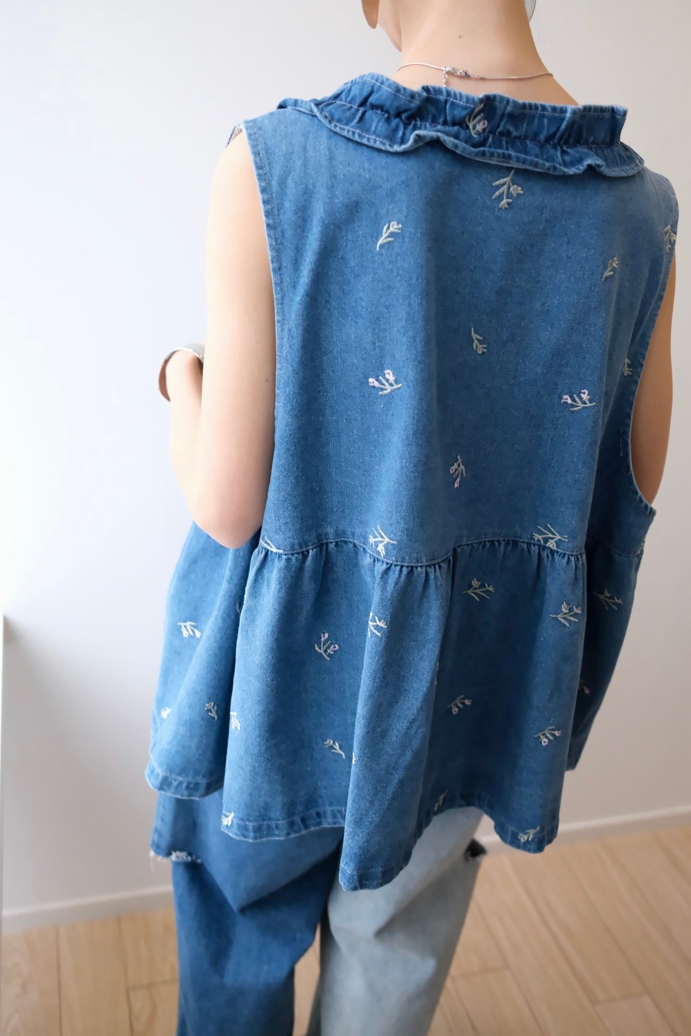 Ruffled Embroidery Denim Vest フリルエンブロイダリーデニムベスト Blue