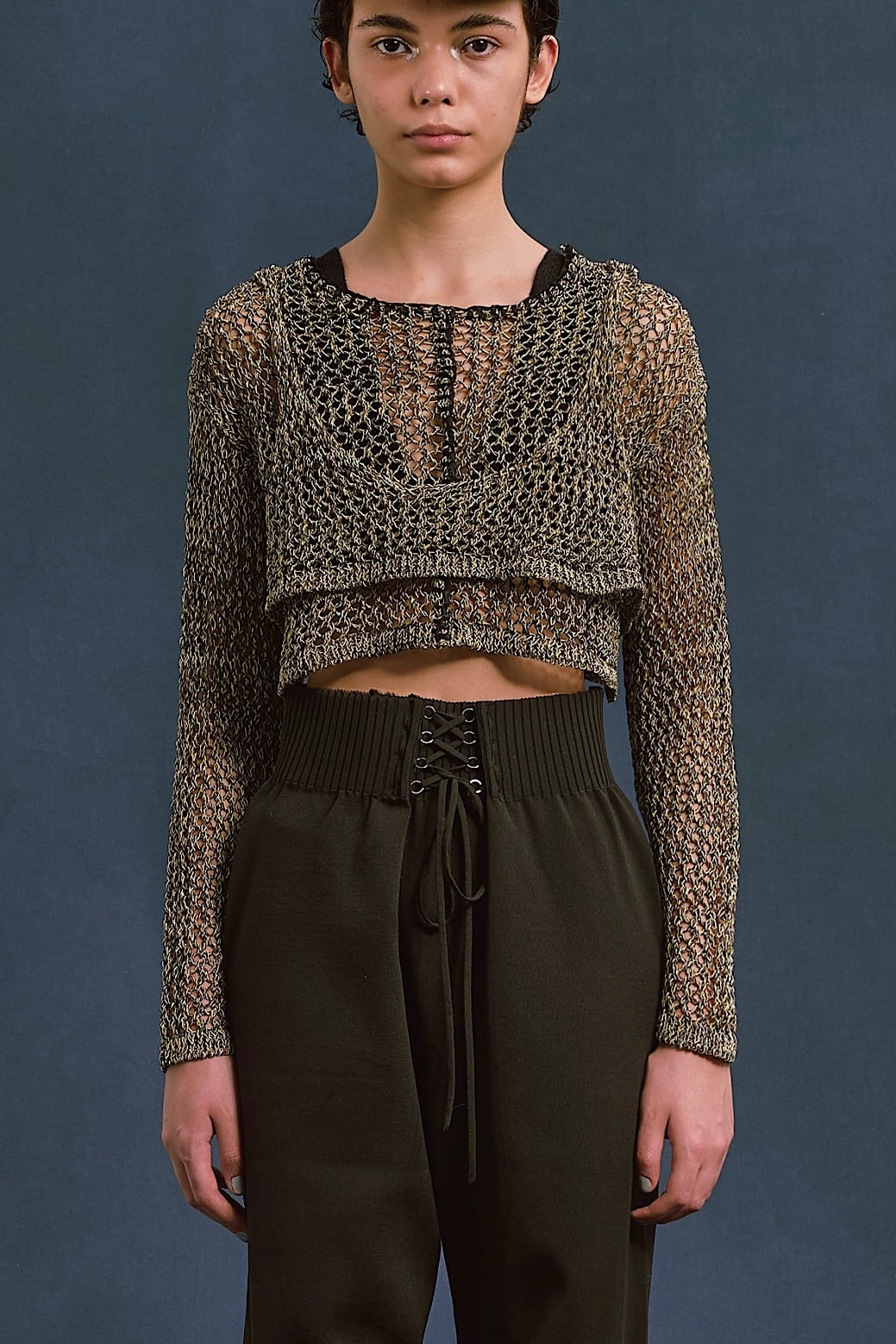 ほのかな光沢のあるコイルヤーンを使用。3色をミックスした立体感のあるメッシュ柄編み。端に施された不織布糸のブランケットステッチがポイント。胸元のブラトップパーツが重ね着ライクなデザイン。ブラトップパーツは後側に回して着用したりアレンジ可能。開きは2段のスプリングホック仕様。前後逆に着用可能で4WAYタイプ。