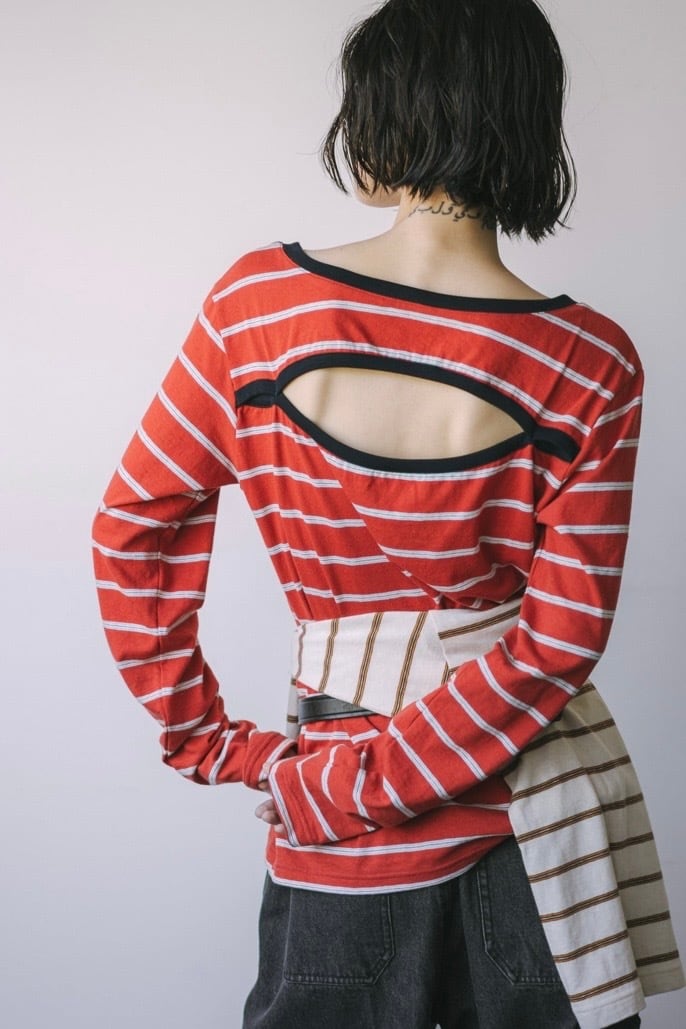 前後で着用でき、スクエアネック面とボートネック面には胸元に空きがあり2wayでお楽しみ頂けます。
