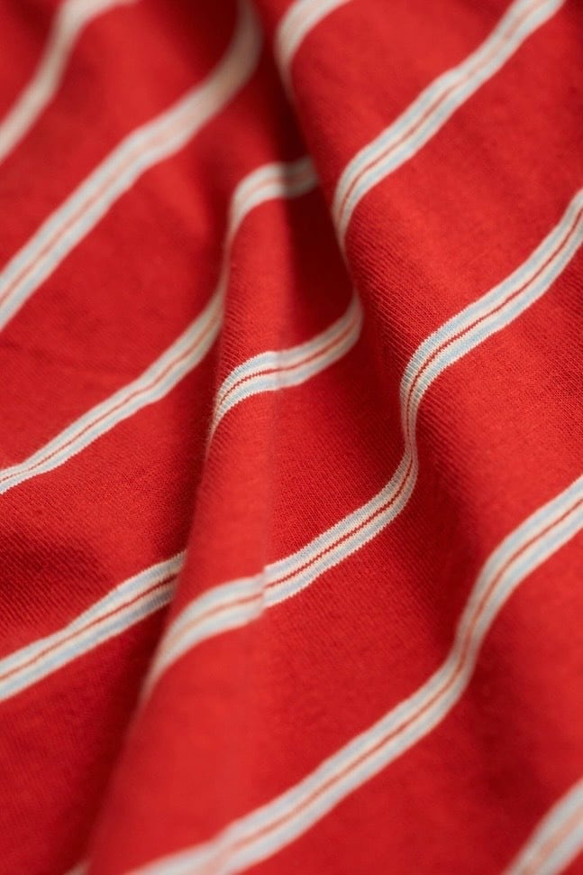 redベースのマルチボーダーには襟ぐりをnavyの配色に