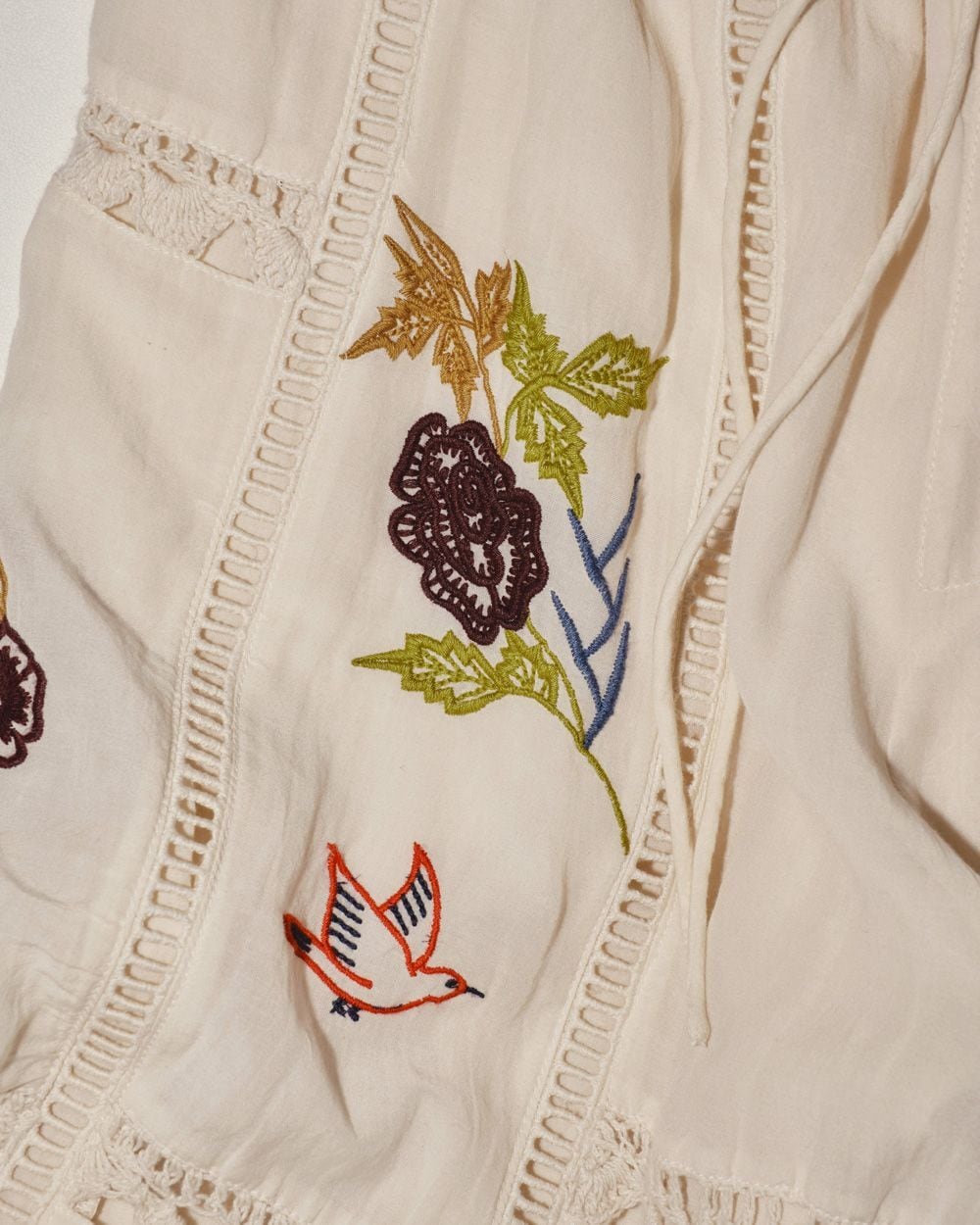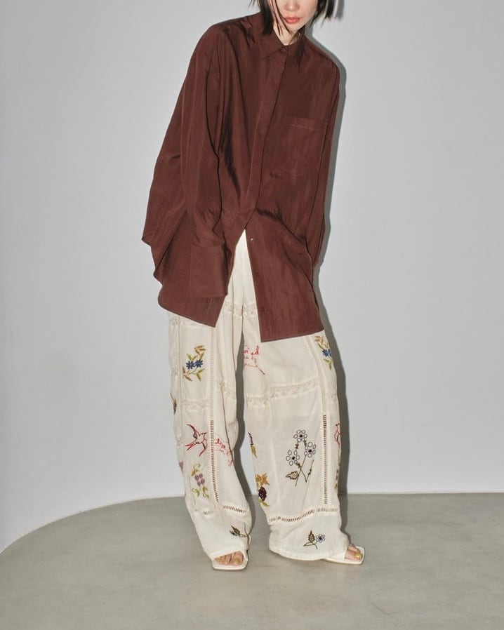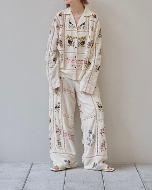 13種類もの刺繍をふんだんにあしらったパッチワークが目を惹くトラウザーズ。インドで一枚一枚に刺繍をあしらい、柄の配置や配色、パッチワークの入り方等こだわりの詰まったアイテム。シンプルなトップストに合わせるだけでこなれた印象に。足元はフラットなサンダル合わせがおすすめです。膝上までの裏地付き。