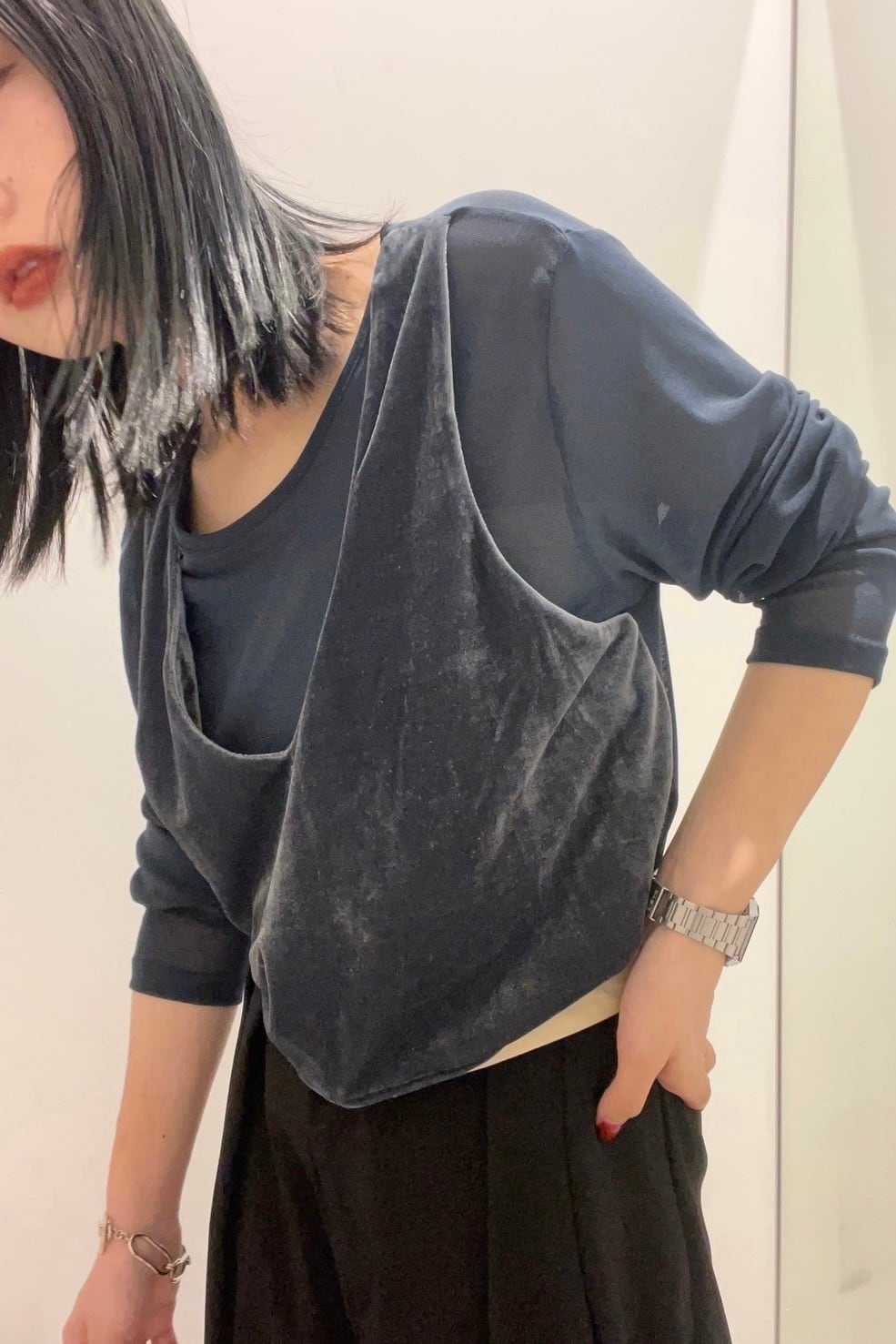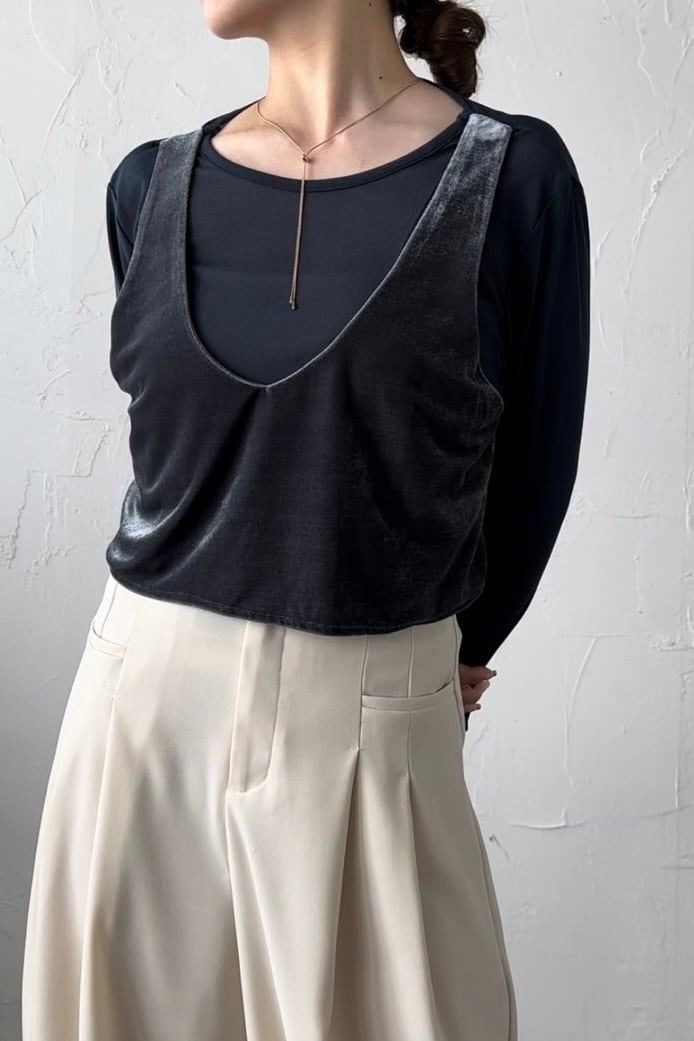 トレンドのレイヤードスタイルが完成するベロアトップス。