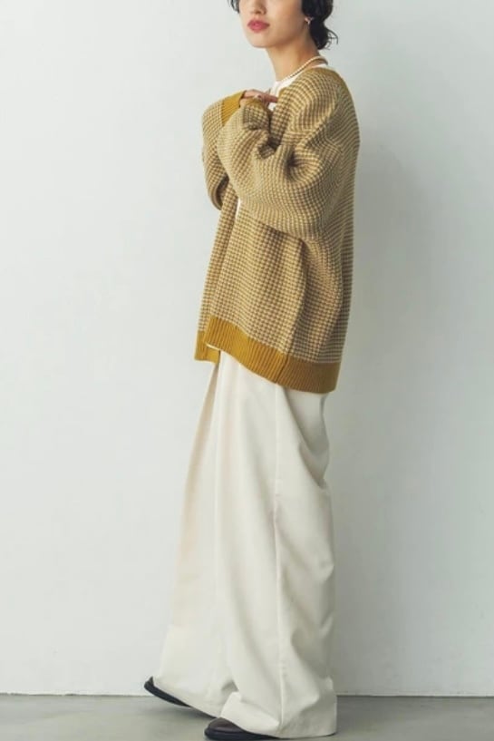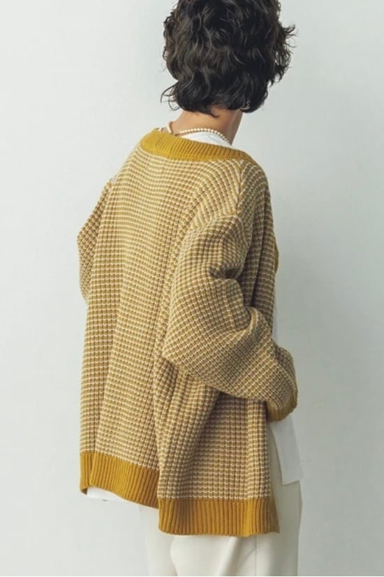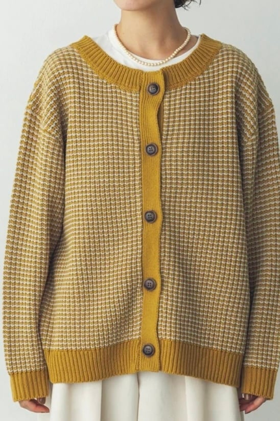 配色感を楽しめる片あぜ編みニットカーディガン。