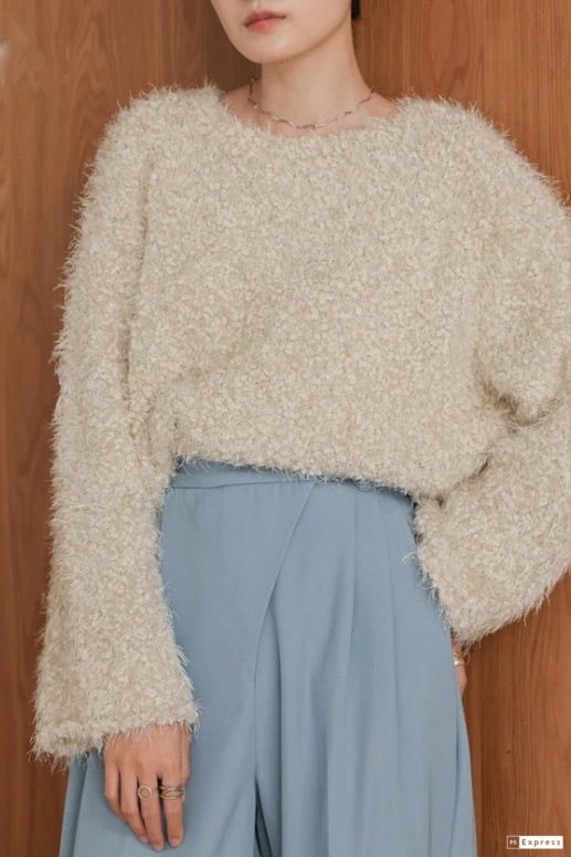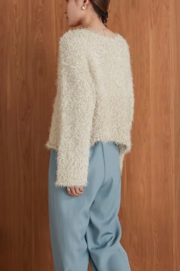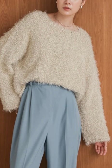 ポップコーンのようなポコポコとした表面感が愛らしい、毛足の長いシャギーニットが登場!ショート丈なのでどんなボトムスともバランスが取りやすく、スタイルアップ効果も期待できます。ゆったりとしたシルエットと女性らしいラウンドネックが、リラクシーな中にも上品さを演出。優しいカラー展開が顔まわりを明るく見せてくれるので、冬のコーデにぴったりです。お家でも外出でも、気分が上がる1枚です。